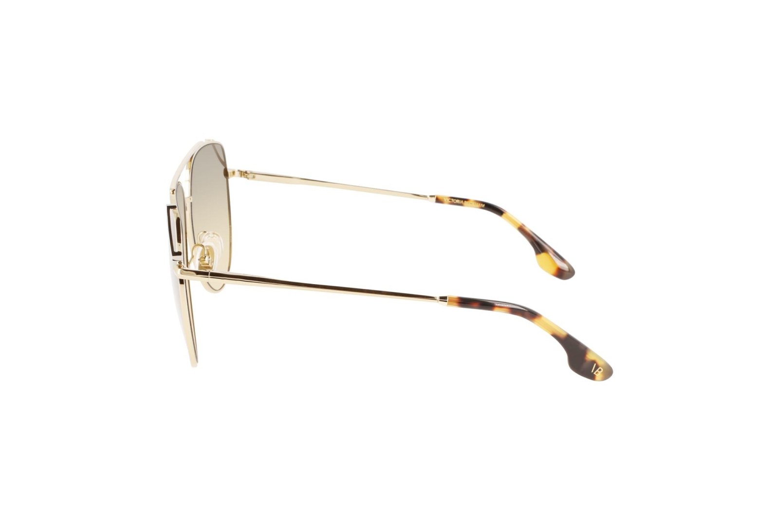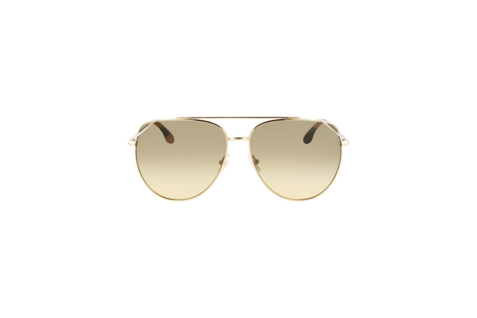 Классическая оправа «авиатор» с двойной надбровной дугой из легкого металла золотого цвета и дужками, украшенными черепаховыми заушниками. Серо-коричневые градиентные линзы на 100% защищают глаза от вредного ультрафиолета. В комплекте — фирменный чехол и салфетка.