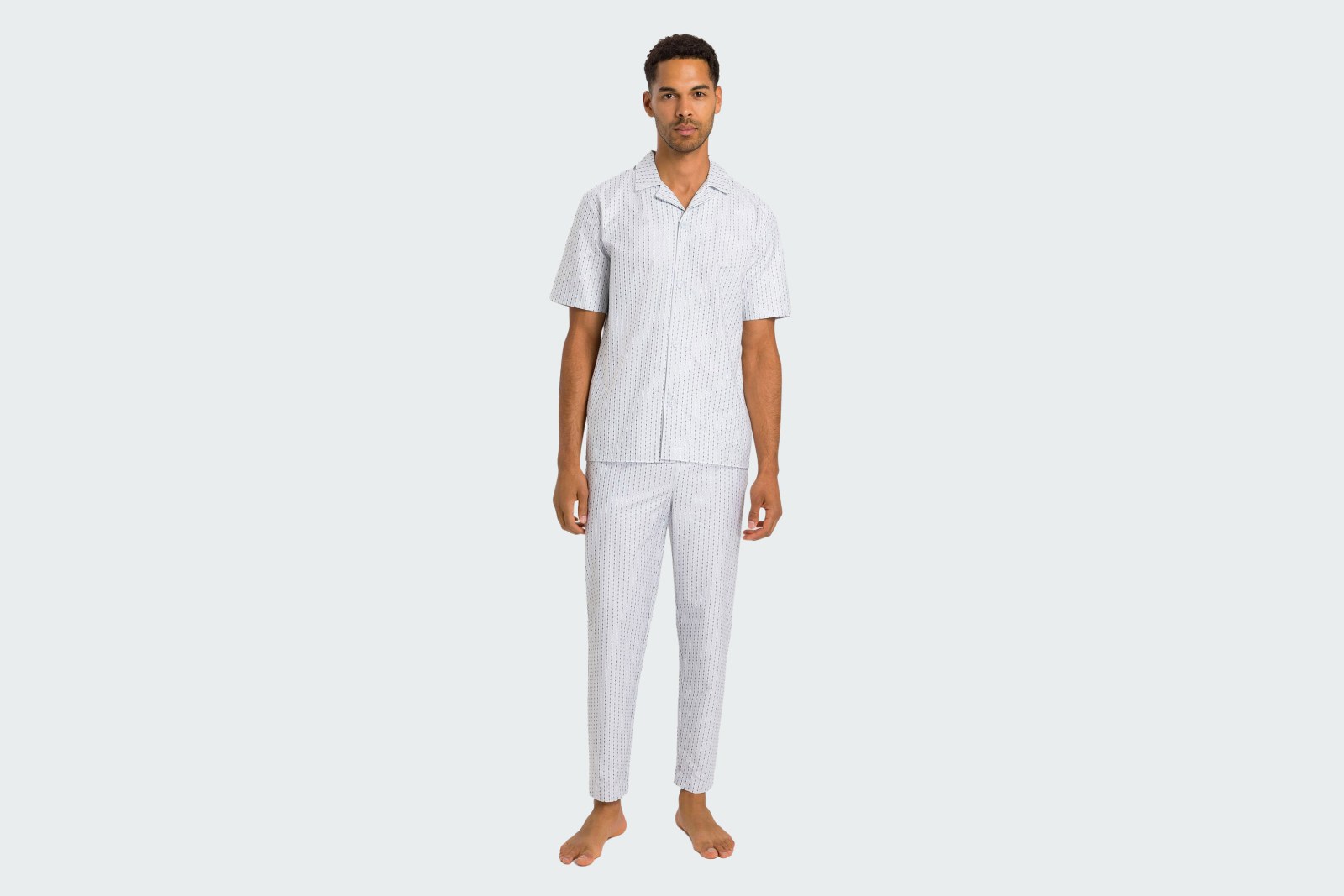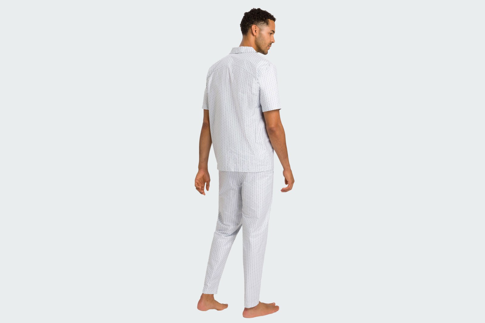 Линия Carl названа в честь соучредителя HANRO Карла Ронуса. Элегантный крой изделий с эстетикой ретро позволяет носить их не только дома, но и выбирать для создания модных образов в стиле pret-a-porter. Отличительной чертой линии стал принт с логотипом HANRO, вдохновленный архивами бренда. Пижама с универсальным дизайном выполнена из 100% мерсеризованного хлопка. Рубашка с коротким рукавом. Пуговичная планка. Ширинка на пуговице. Зауженные брюки с боковыми карманами и ширинкой на пуговице.