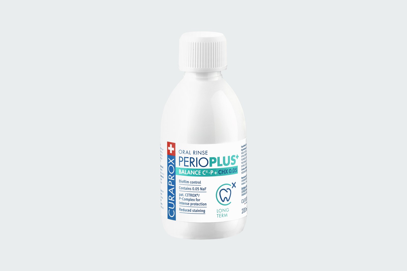 Жидкость-ополаскиватель Perio Plus Balance с содержанием хлоргексидина 0,05%. Рекомендована для профилактики возникновения кариеса и гингивита, для оказания антимикробной защиты полости рта, для профилактики заболеваний полости рта, для снижения риска размножения бактерий на щетине щетки (опускать зубную щетку в стакан с ополаскиватели на 7-10 минут). Использовать не более 4-х недель
