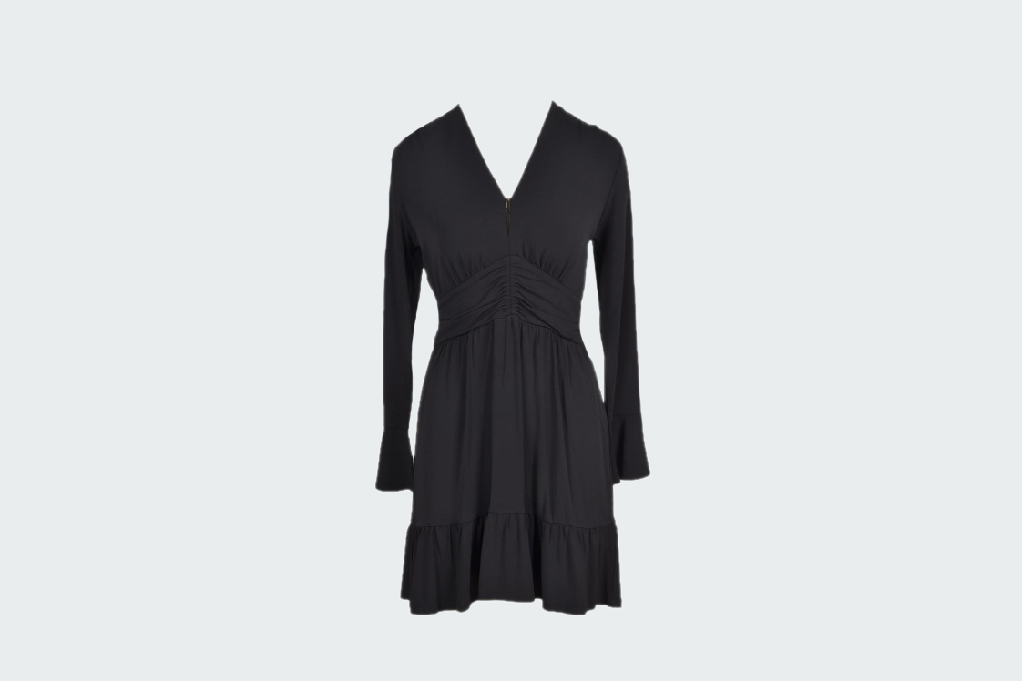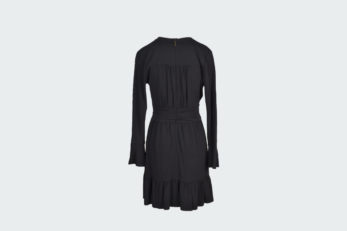 Короткое платье с длинными рукавами и V-образным вырезом. Пояс с драппировкой подчеркивает фигуру и женственный силуэт. Широкая оборка снизу и на рукавах создает игривый и притягательный образ. Застежка-молния на спинке.
