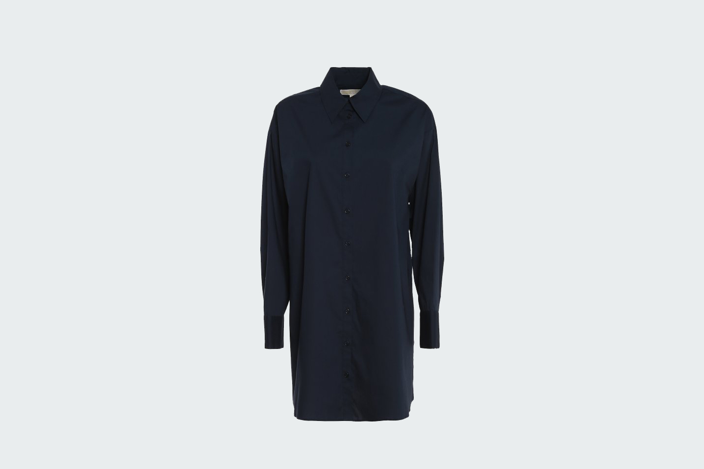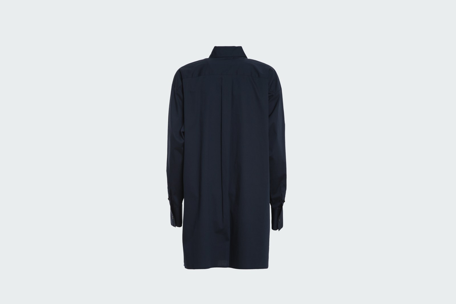Элегантное платье-рубашка прямого кроя глубокого синего цвета. Строгий воротник и манжеты на пуговице дополняют утонченную модель.