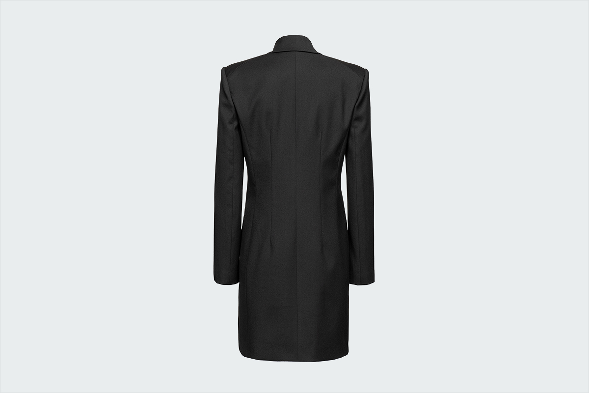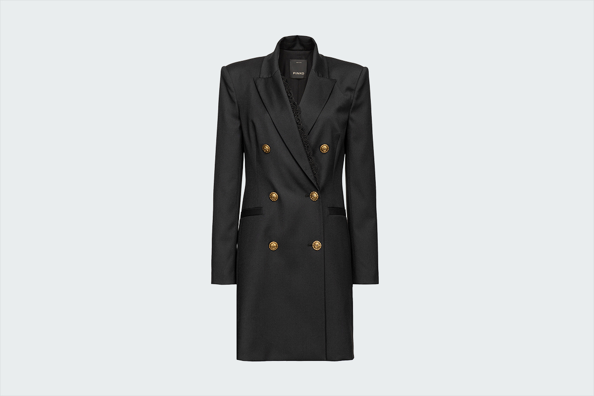 Короткое платье-пальто, стилизованное под блейзер, выполнено из эластичной смесовой шерстяной фланели. Воротник с лацканами и кружевной окантовкой, длинные рукава с круглой проймой, структурированной линии плеч и боковые прорезные карманы. Модель на подкладке. Двубортная застежка на пуговицы из золотистого металла.