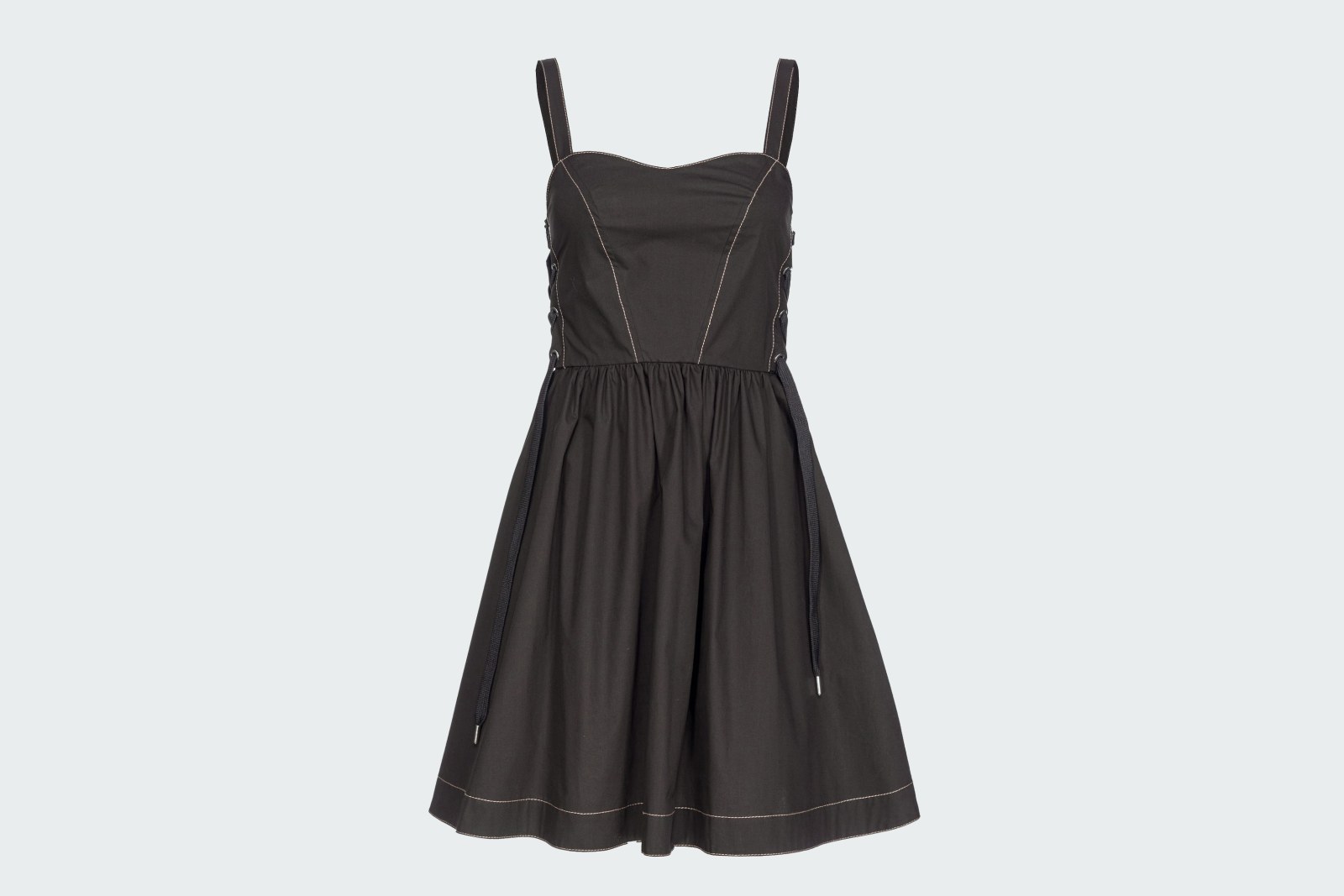 Приталенный топ с тонкими бретелями, вырезом в форме сердца и деталями в стиле бюстье со скрещенными завязками. Короткая расклешенная юбка с боковыми карманами и мягкими складками.