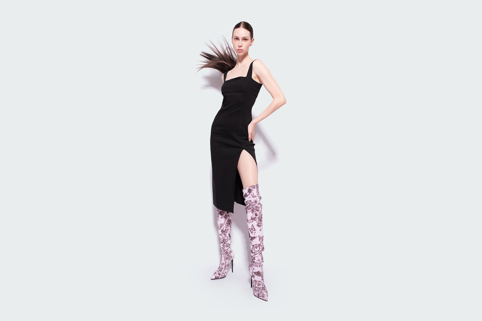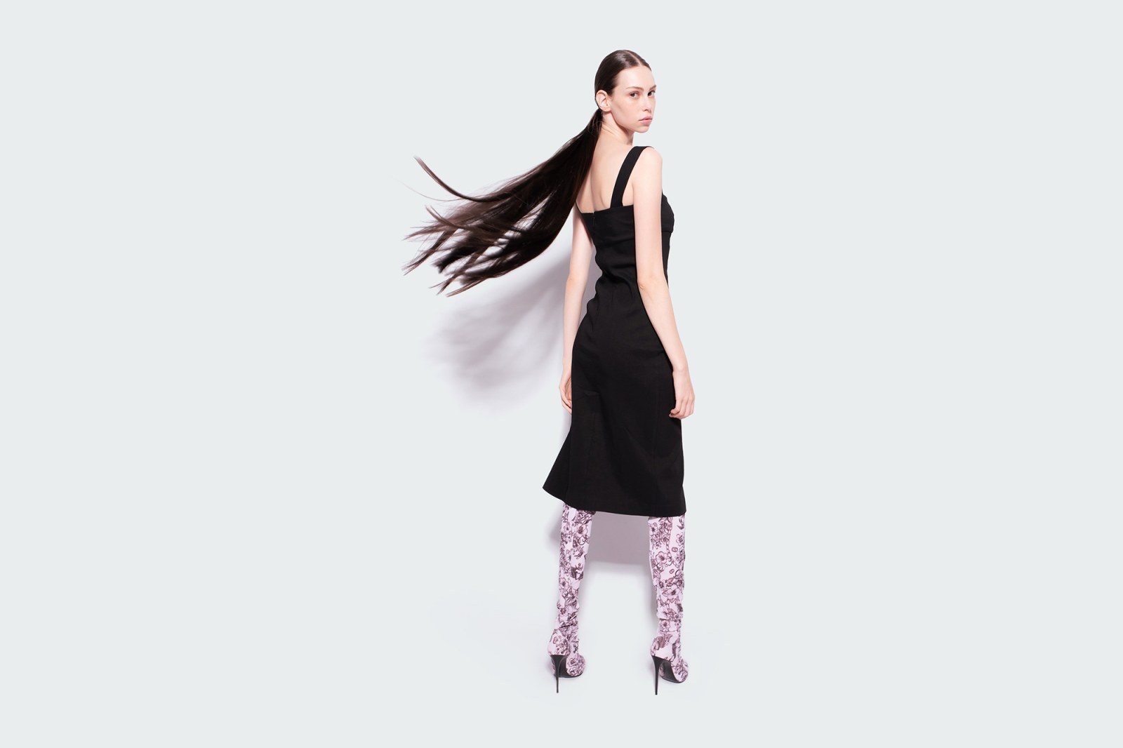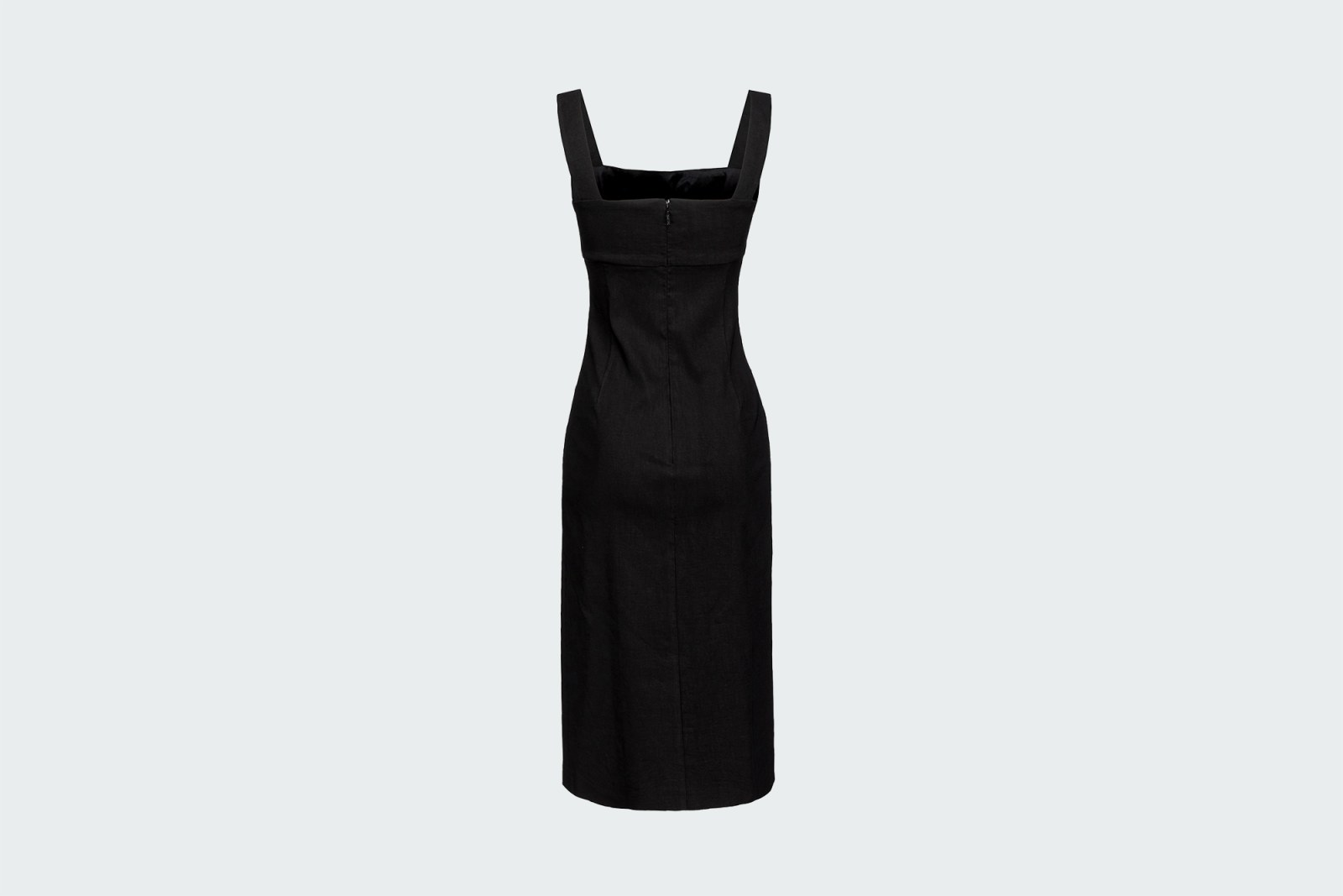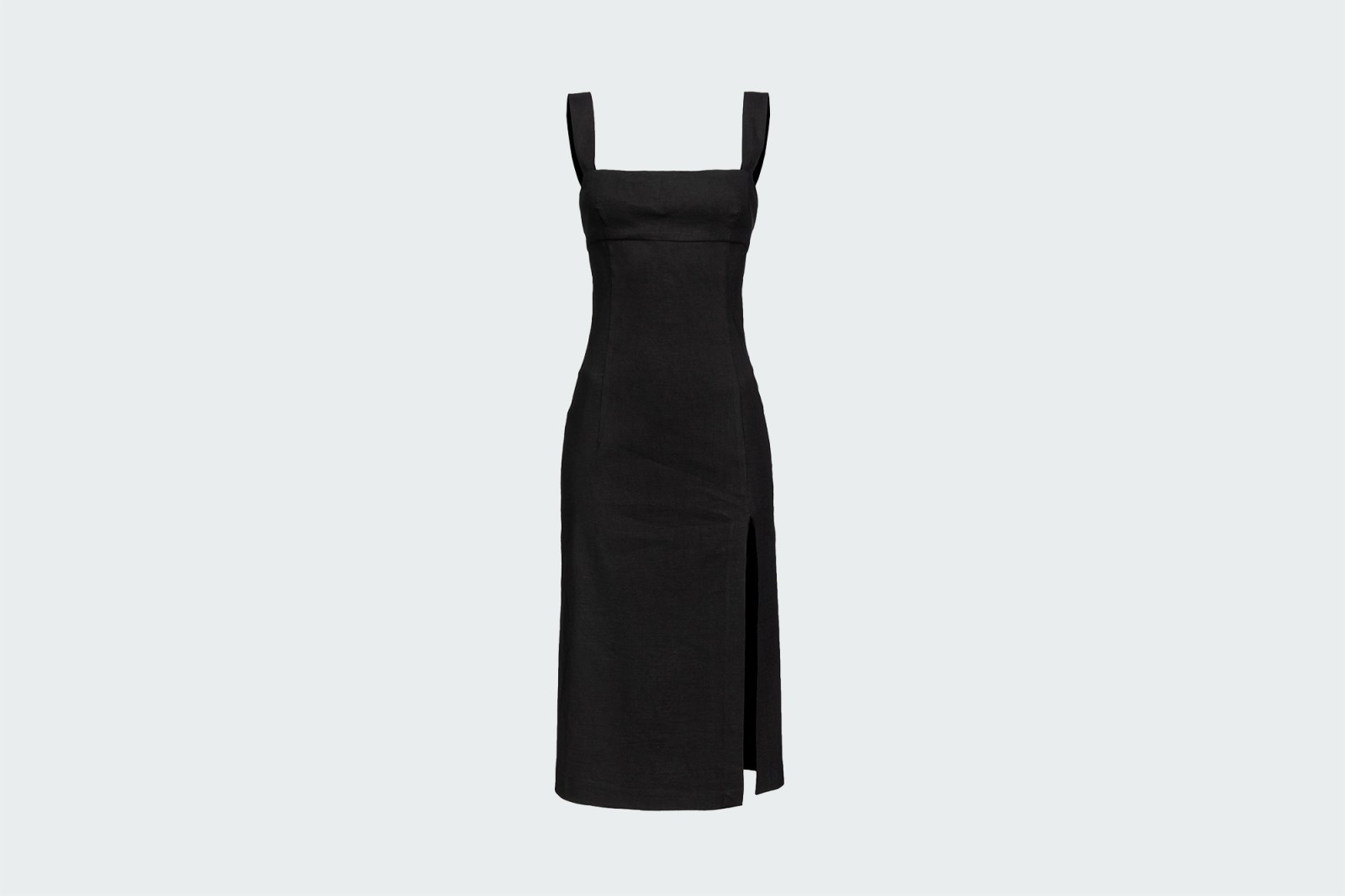 Платье-миди без рукавов выполнено из эластичной ткани на основе льна и вискозы. Бретели, прямой вырез спереди и сзади и струящаяся юбка с боковым разрезом. Потайная застежка-молния по центру спинки.