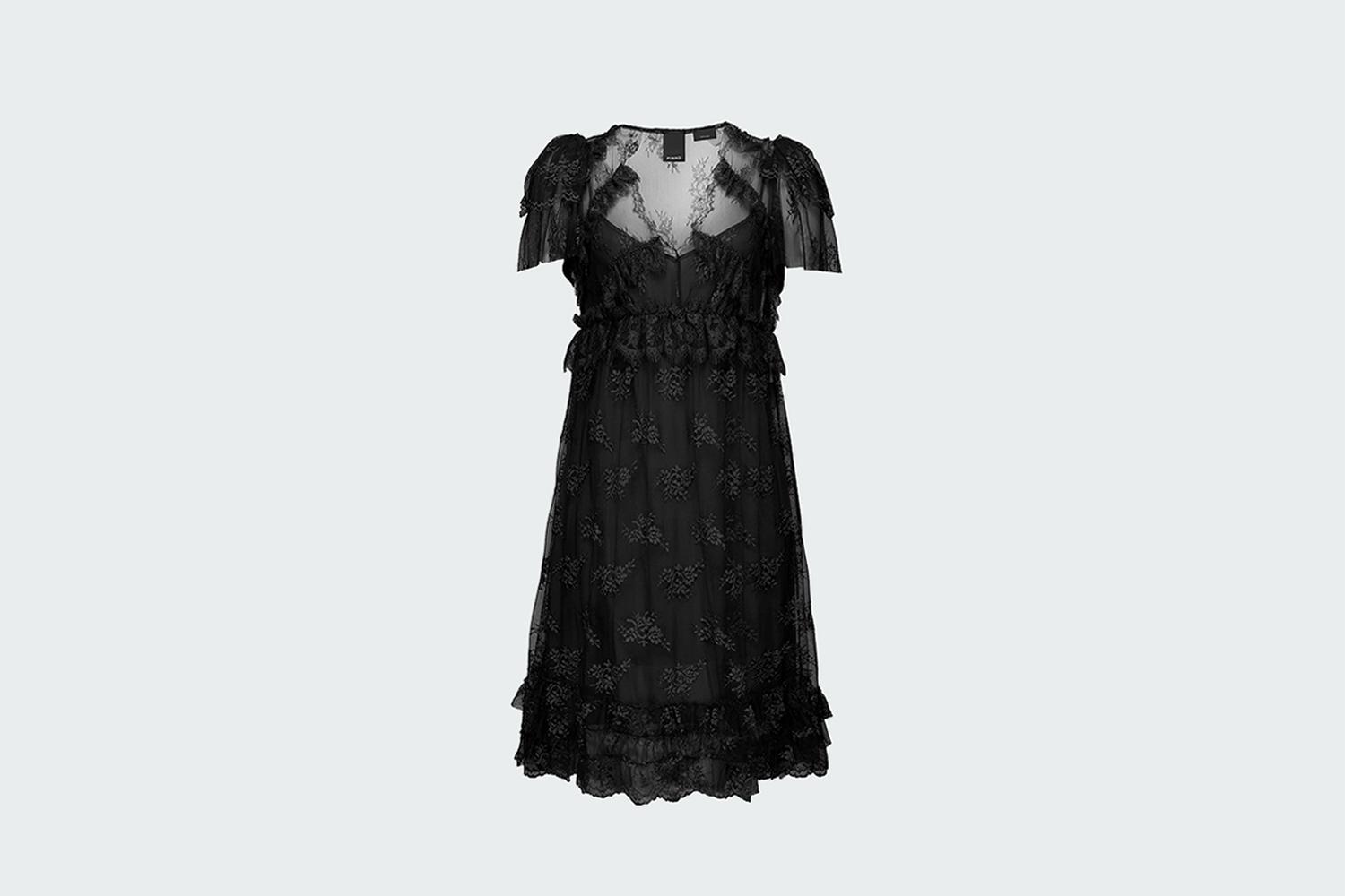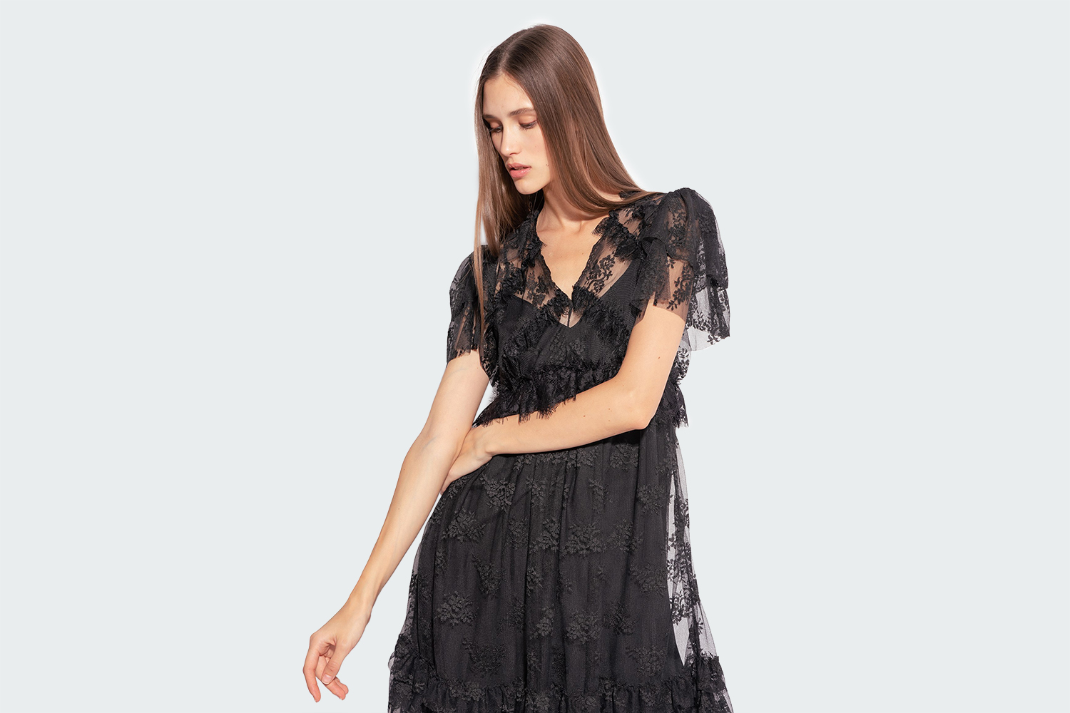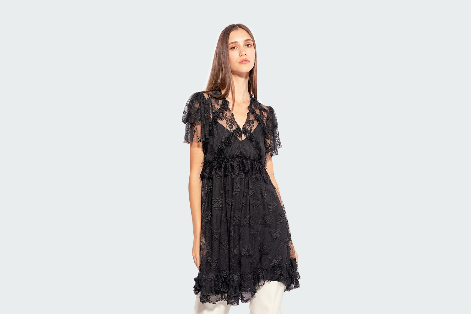 Короткое платье из кружева с окантовкой и деталями с оборками. V-образный вырез, рукава-крылышки длиной до локтя, высокая линия талии, оборки в нижней части. Модель дополнена комбинацией в тон, выступающей в качестве подкладки.