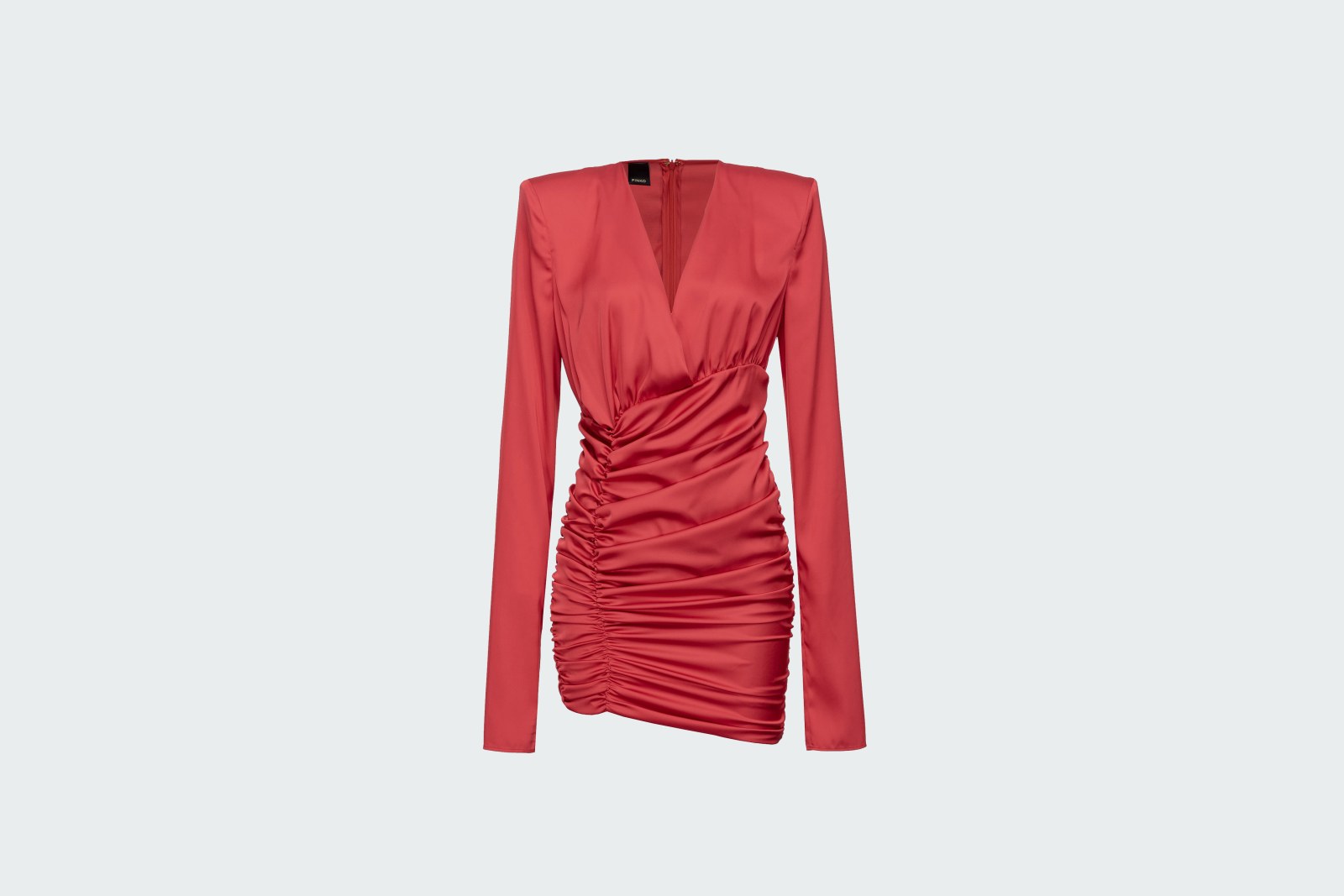 Короткое платье облегающего силуэта выполнено из легкого эластичного атласа с особым полуглянцевым эффектом. V-образный вырез, структурированная линия плеч, длинные рукава и юбка со сборками и драпировкой. Потайная застежка-молния по центру спинки.