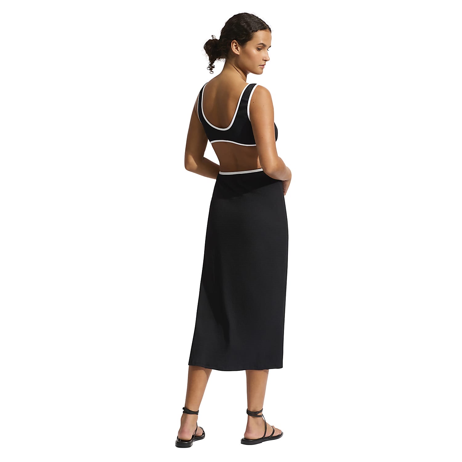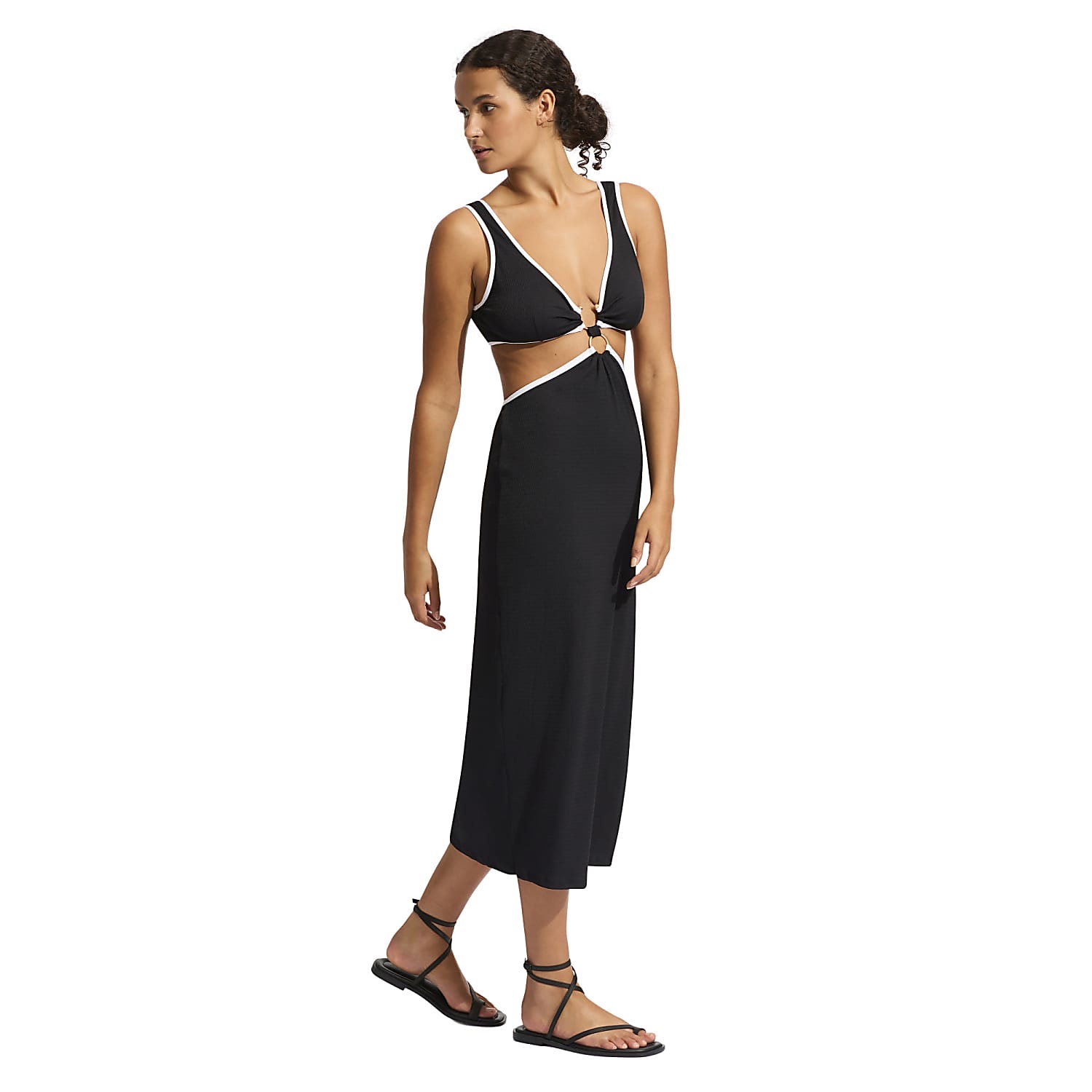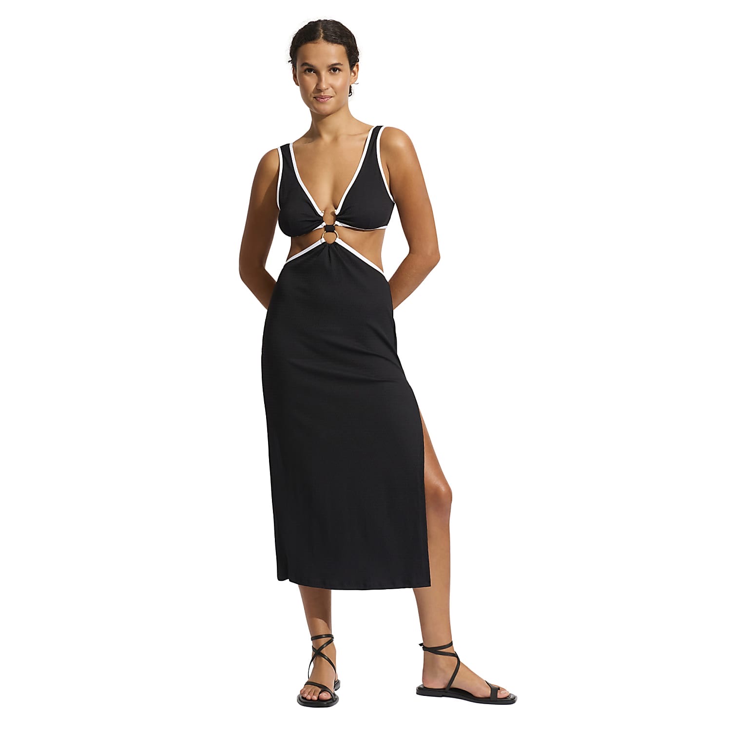 Глубокие вырезы, декоративная металлическая деталь на груди. Длина миди, разрез на бедре.