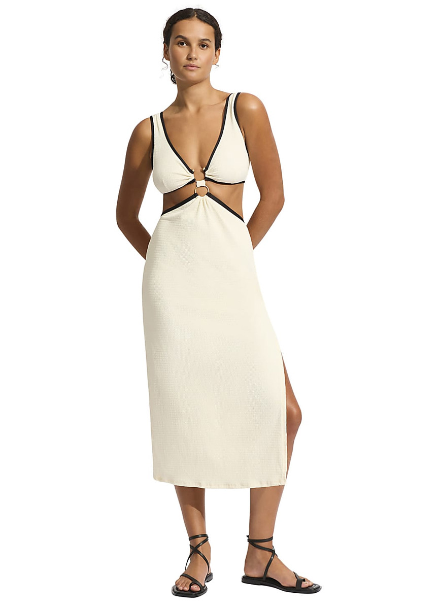 Глубокие вырезы, декоративная металлическая деталь на груди. Длина миди, разрез на бедре.