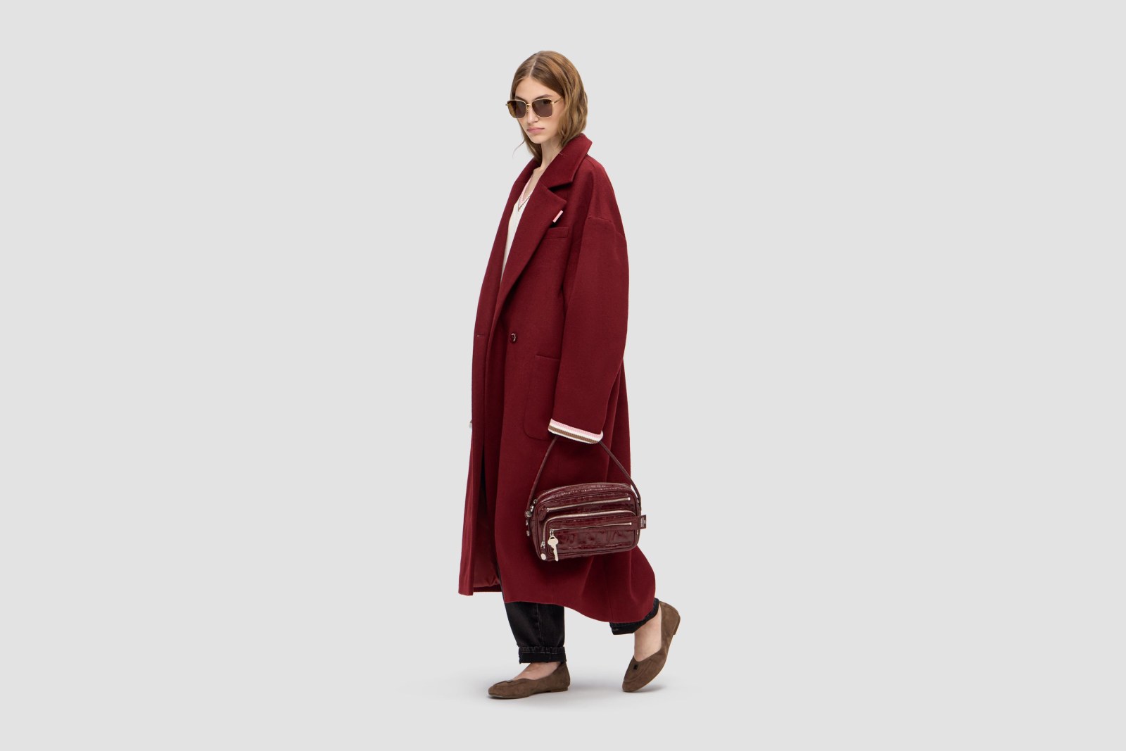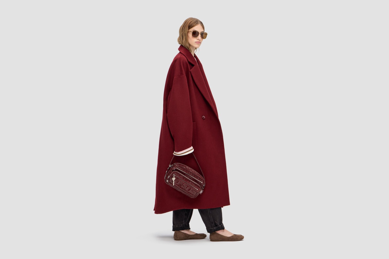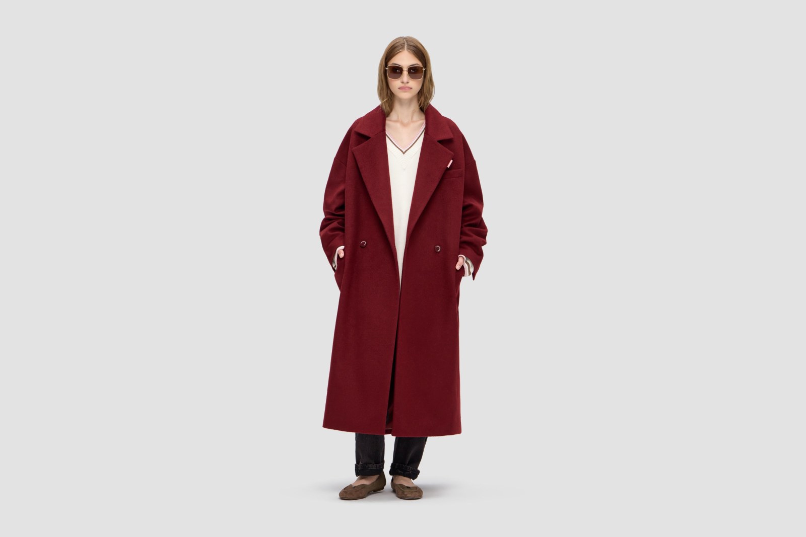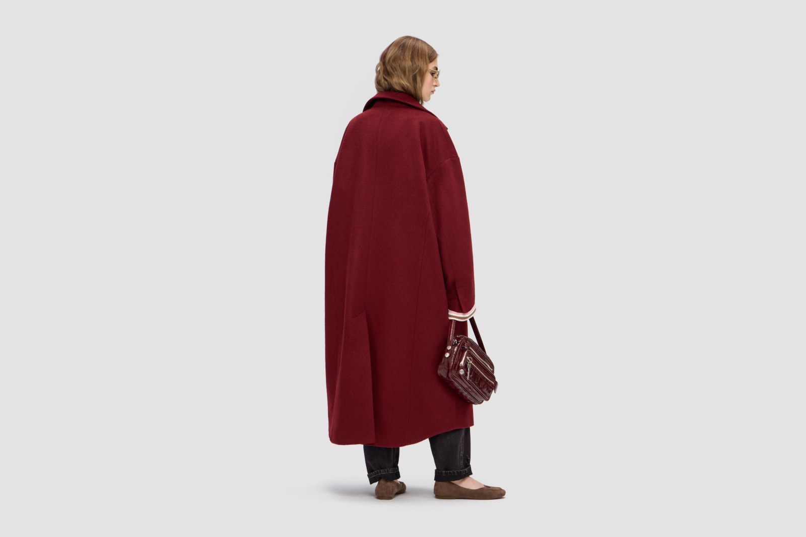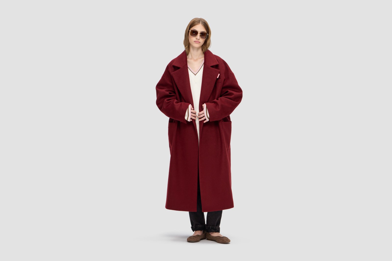 Пальто оверсайз-кроя, выполненное из шерстяного полотна. Натуральный подклад с вискозой в составе позволяет телу "дышать". Изделие оснащено плоскими карманами без клапана с двух сторон. Тип застежки: пуговицы. Полимерная нашивка розового цвета с логотипом на лацкане. Фирменная упаковка в брендированный чехол.