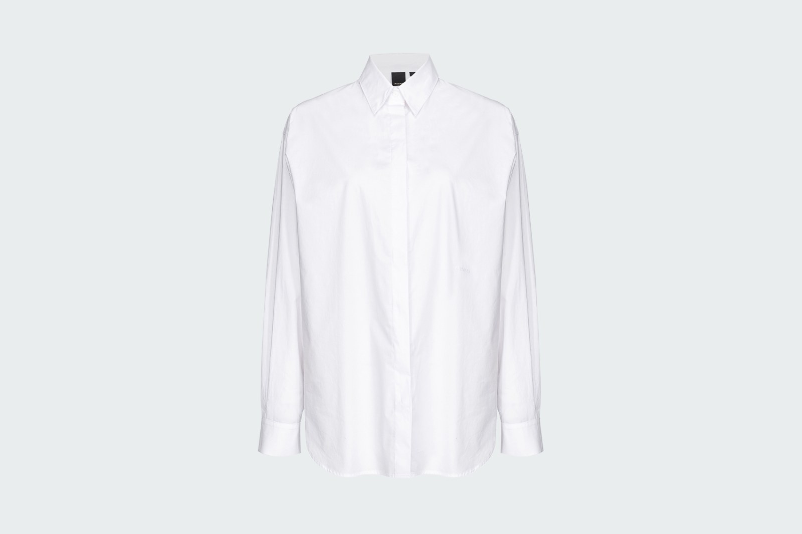 Рубашка слегка объемного классического кроя выполнена из поплина на основе чистого хлопка. Классический воротник и длинные рукава с манжетами. Миниатюрный вышитый логотип PINKO спереди. Планка на потайных пуговицах спереди, видимая верхняя пуговица.