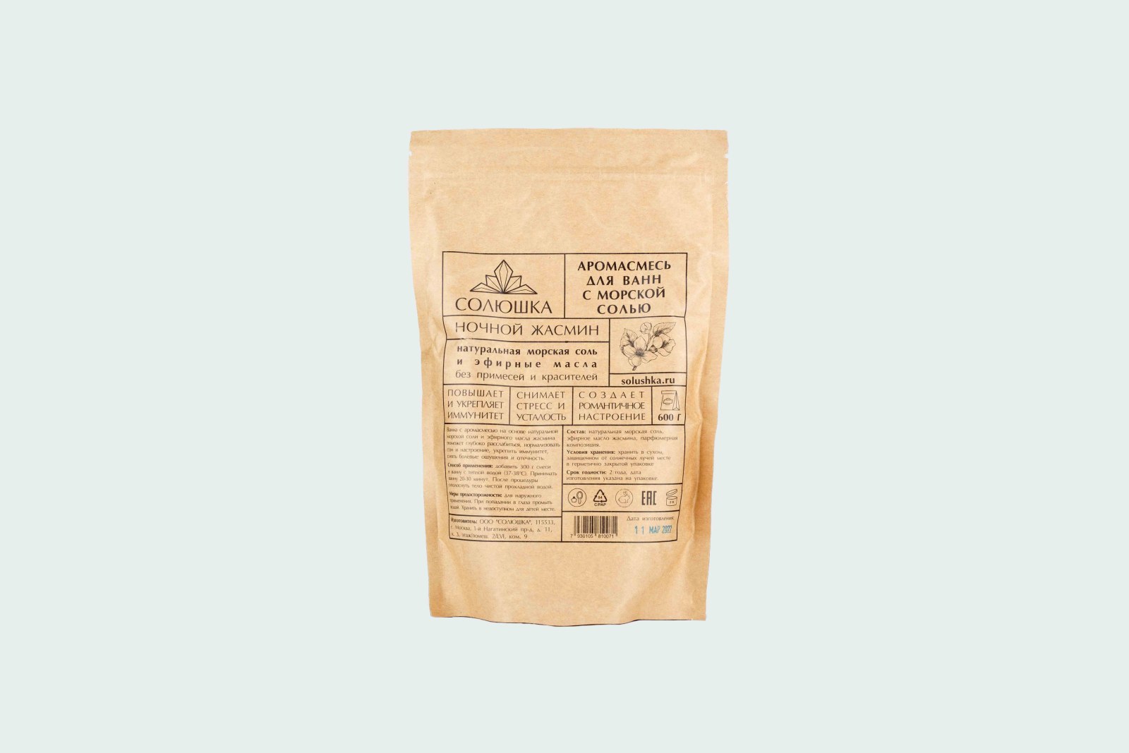 Ванна с ароматической смесью на основе натуральной морской соли и эфирного масла жасмина поможет расслабиться после тяжёлого дня и вернуть здооровый сон. Принятие ванны так же поможет снять болевые ощущения в мышцах и отёчность и окажет благотворное влияние на иммунитет. Масло жасмина в составе создаст приятную романтическую атмосферу за счёт нежного, обволакивающего аромата.