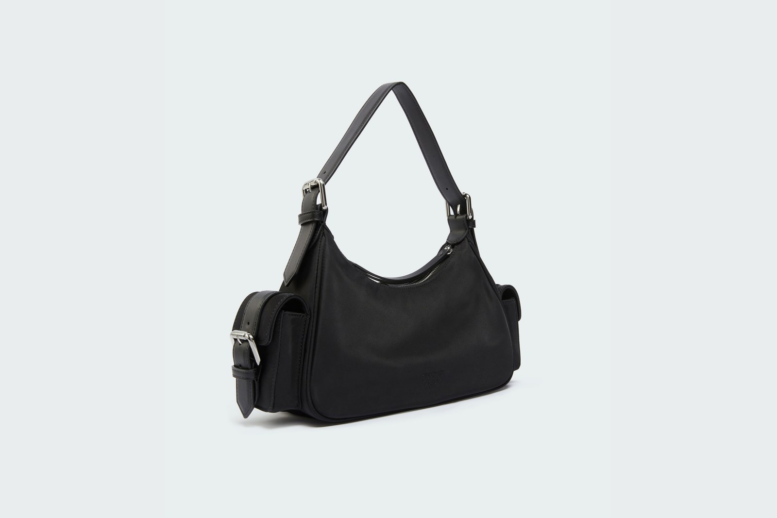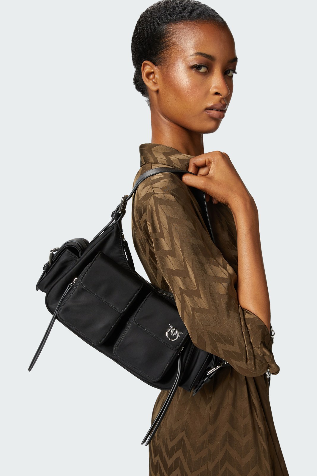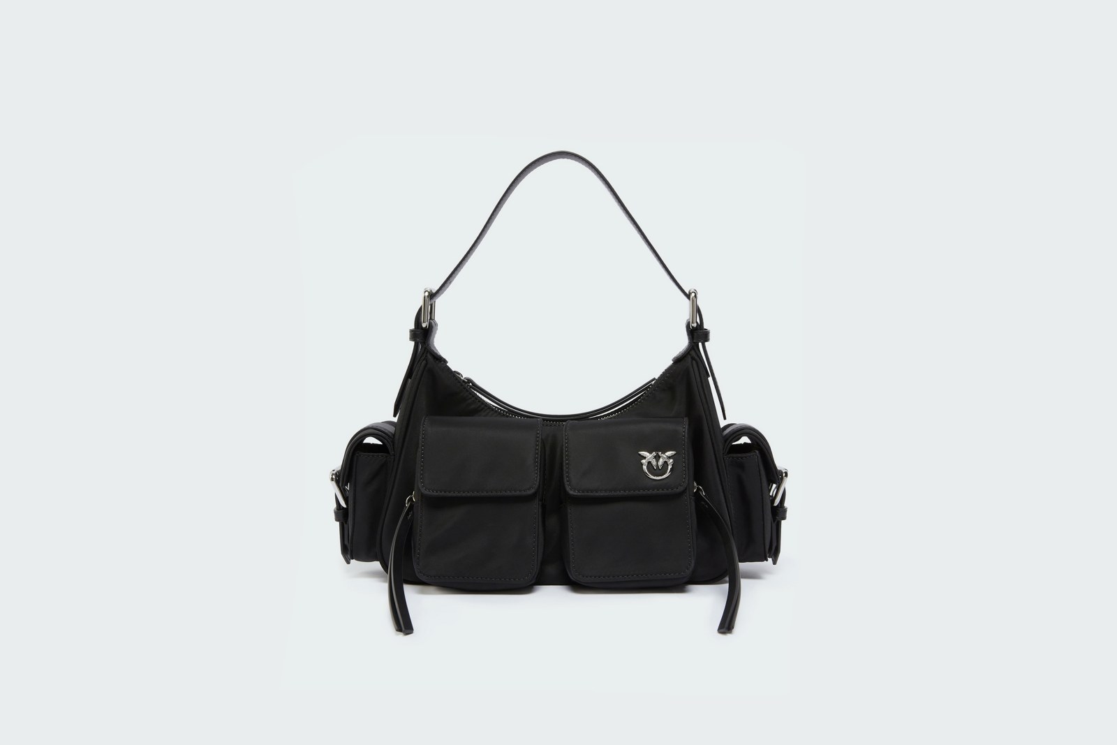 Сумка Cargo Bag с несколькими отделениями сделана из переработанного высокотехнологичного текстиля. Удлинённая модель оснащена практичными передними и боковыми карманами с клапанами в утилитарном стиле. Металлическая пластина с логотипом Love Birds Diamond Cut, покрытая гальваническим составом цвета старого серебра, придаёт дизайну индивидуальность. Ручки, застёжка и ремешки изготовлены из регенерированной кожи. Подкладка выполнена из переработанной ткани.