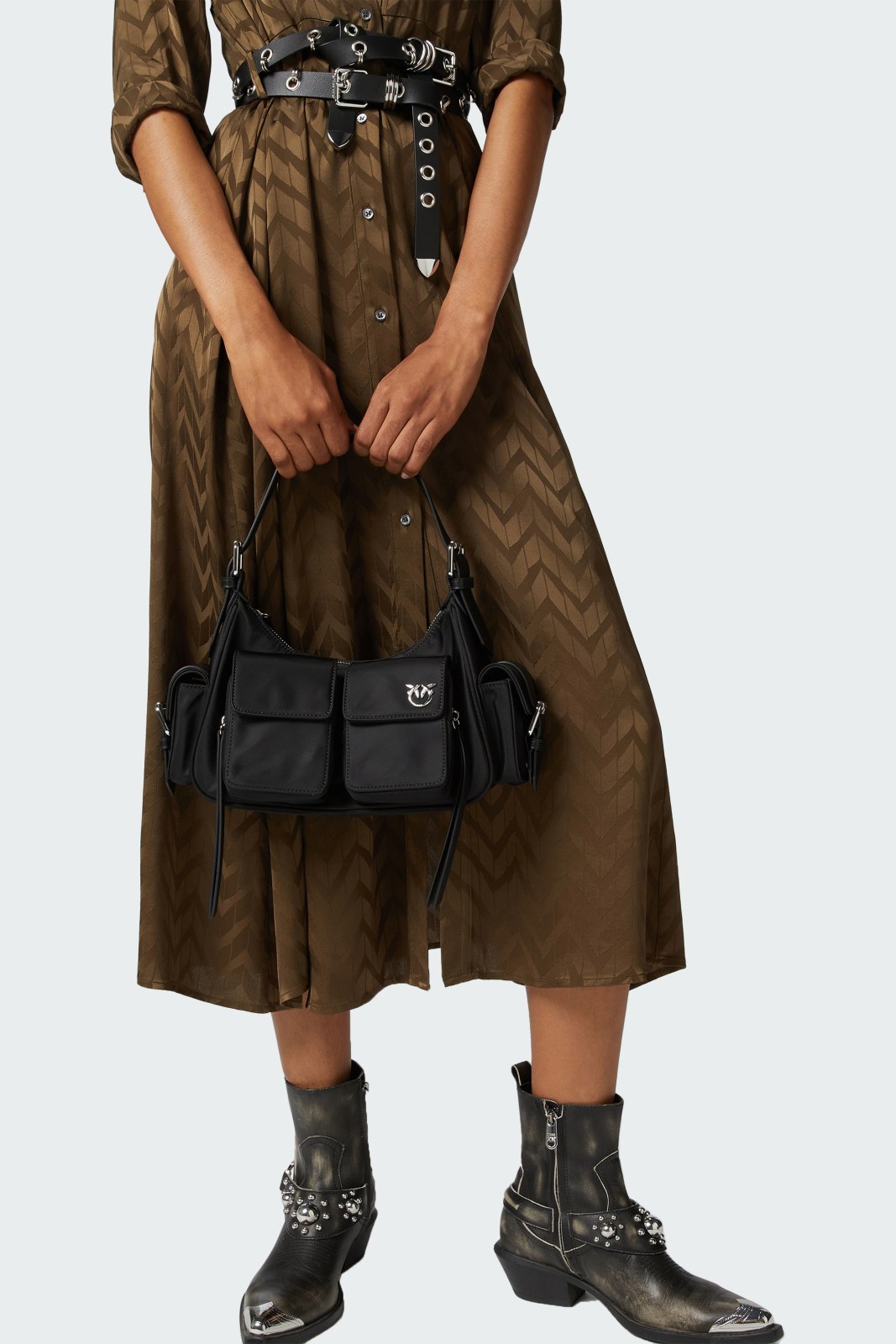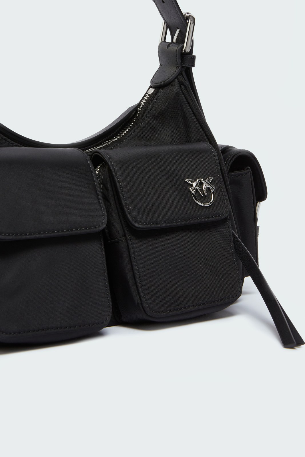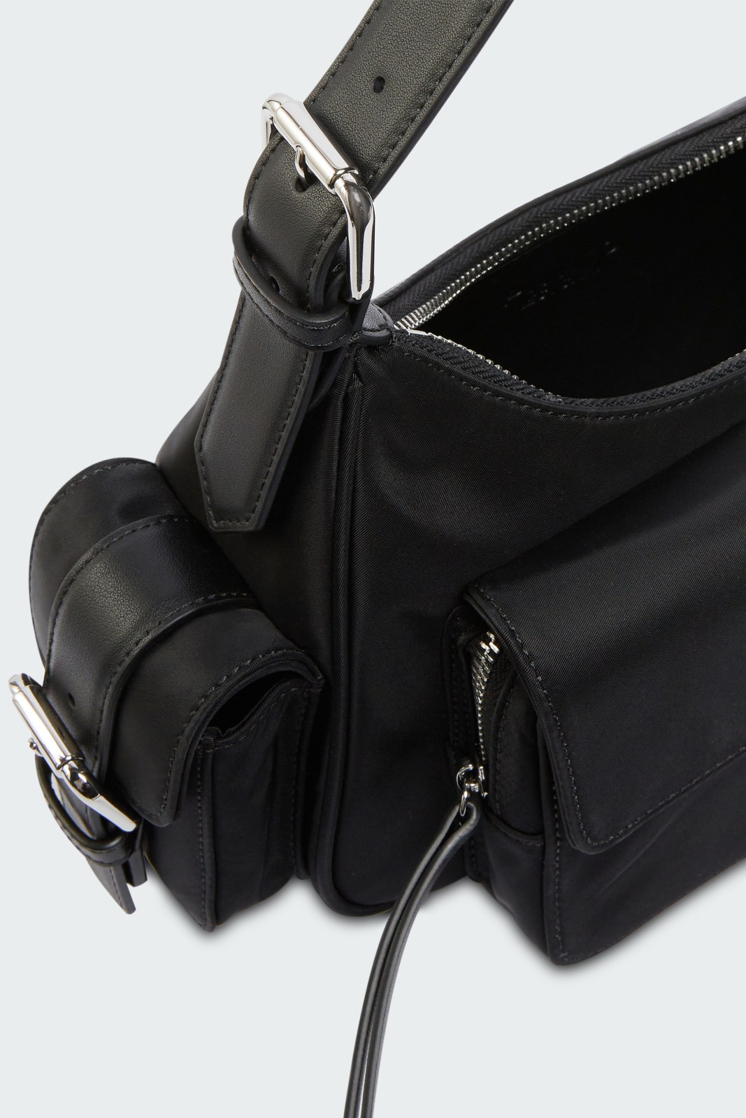 Сумка Cargo Bag с несколькими отделениями сделана из переработанного высокотехнологичного текстиля. Удлинённая модель оснащена практичными передними и боковыми карманами с клапанами в утилитарном стиле. Металлическая пластина с логотипом Love Birds Diamond Cut, покрытая гальваническим составом цвета старого серебра, придаёт дизайну индивидуальность. Ручки, застёжка и ремешки изготовлены из регенерированной кожи. Подкладка выполнена из переработанной ткани.