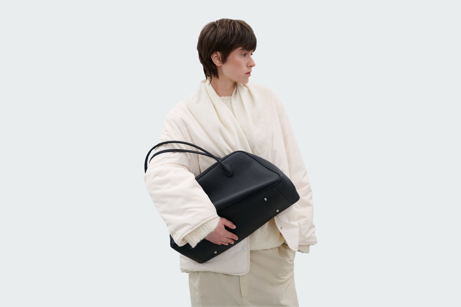 Мелкозернистая телячья кожа подчёркивает глубину цвета, сохраняя его матовую силу и осязаемую ясность. В формате Large модель выглядит монументально, сохраняя при этом пластичность и удобство.