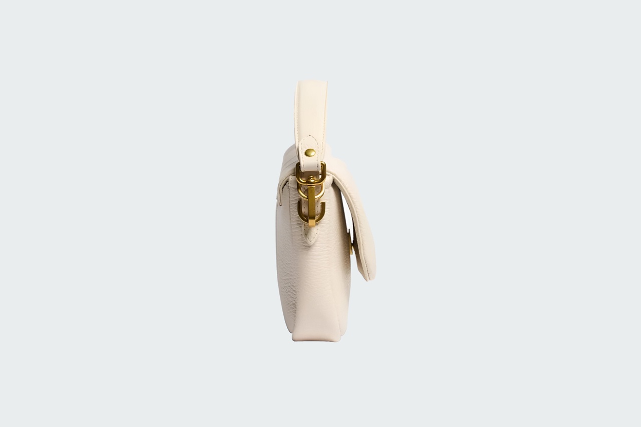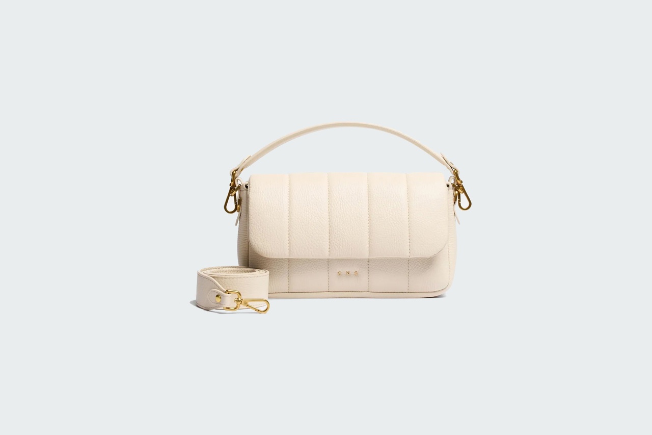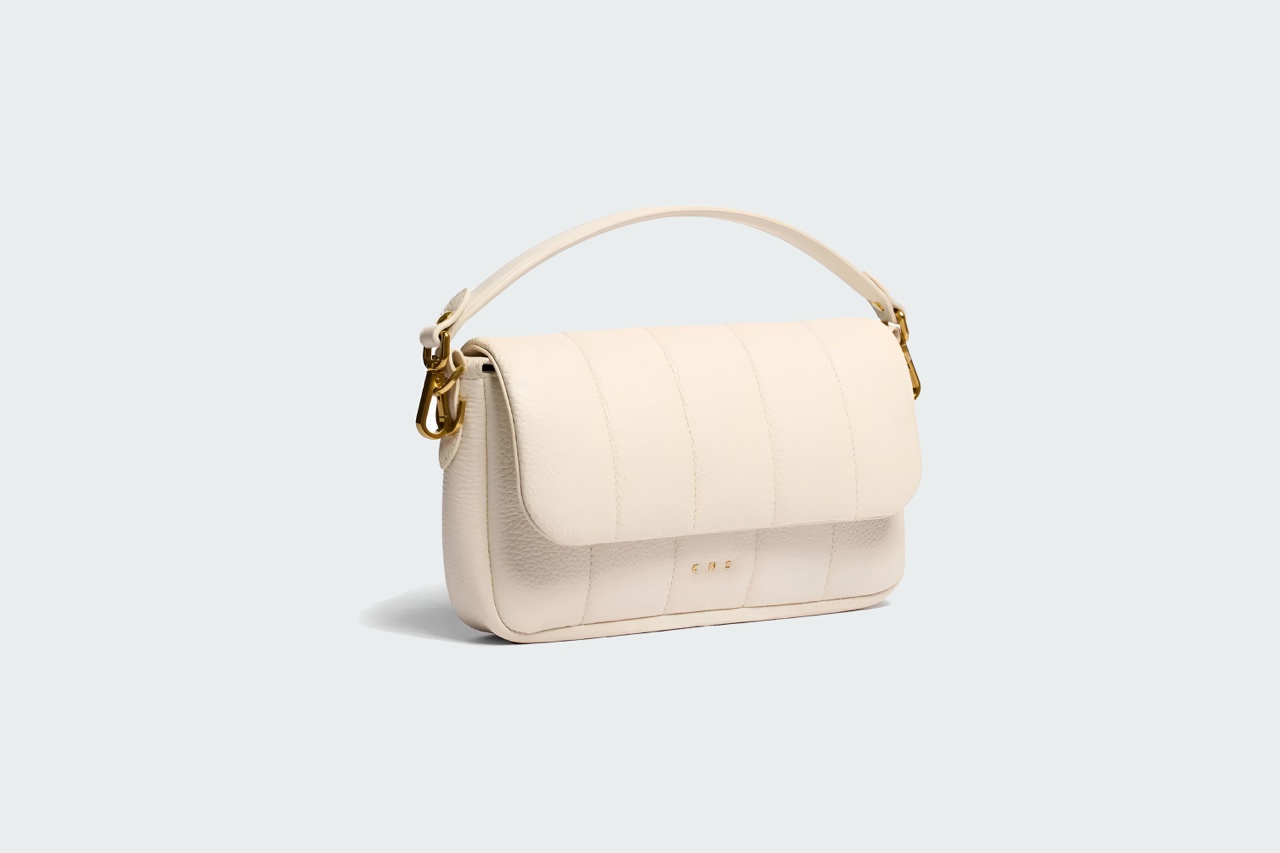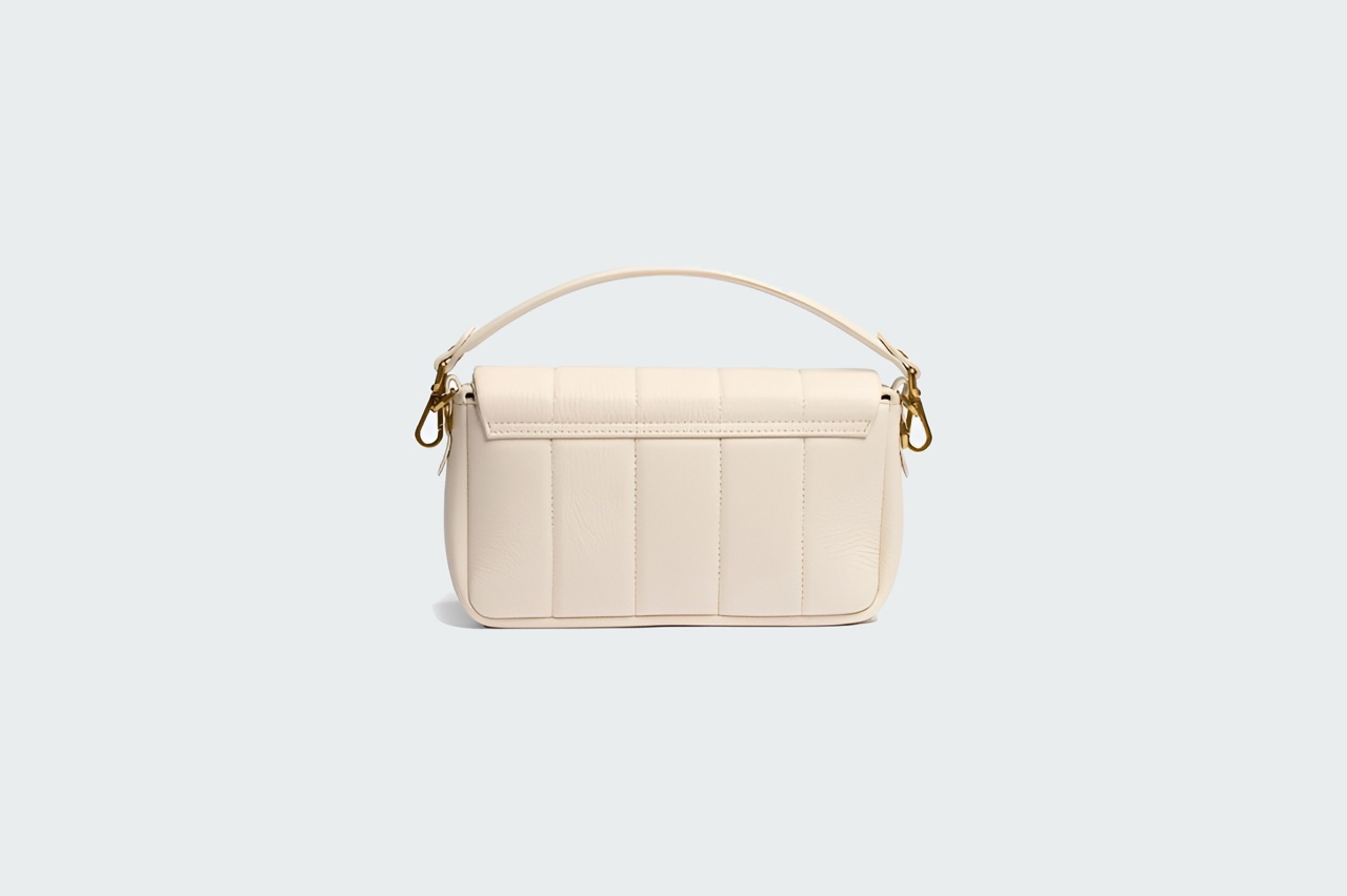Актуальная форма сумки подчеркнута объемной стежкой. Аксессуар выполнен из мягкой зернистой кожи и дополнен лаконичным логотипом бренда. В комплекте по традиции есть съемные широкая ручка и плечевой ремень.