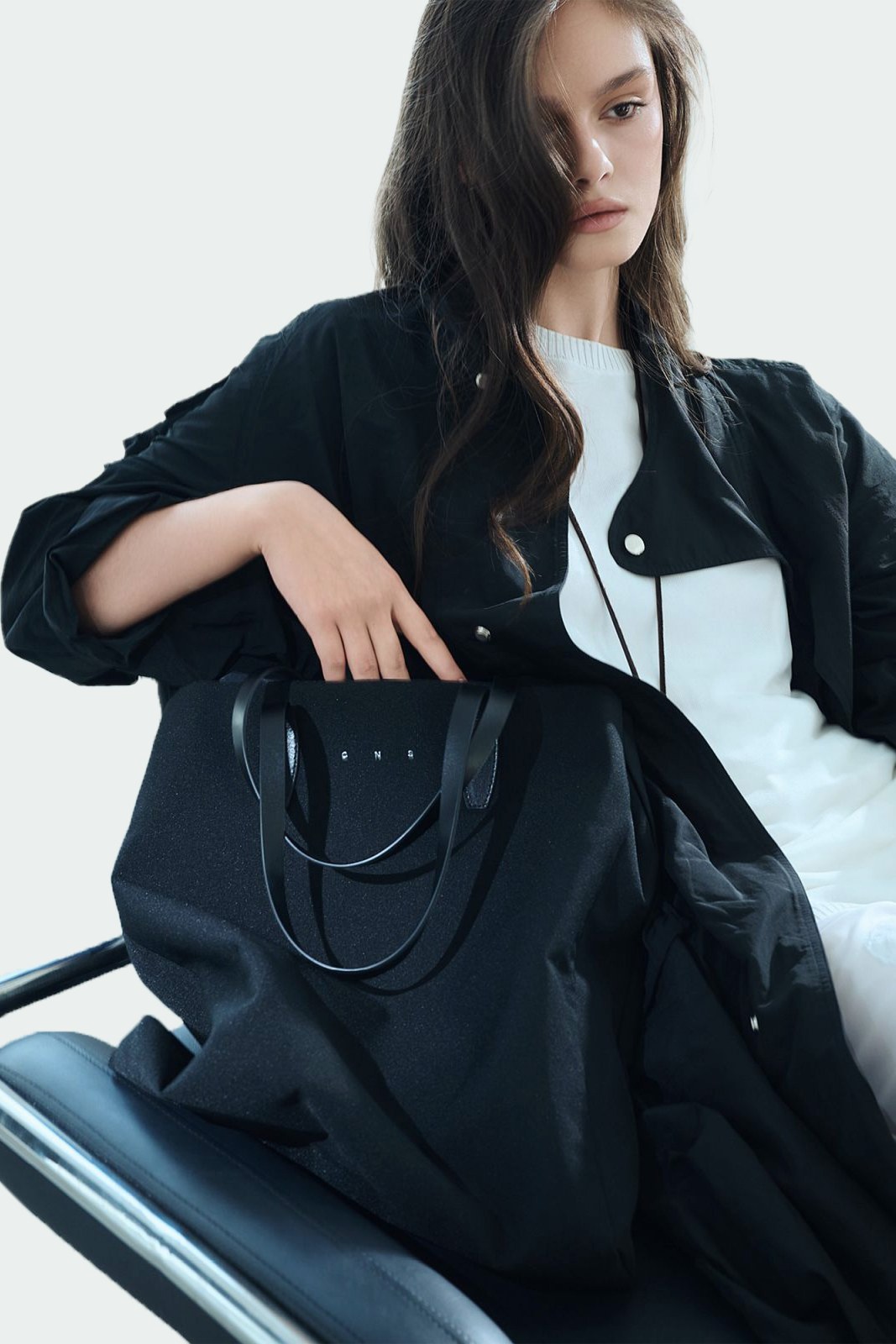 Узкие кожаные ручки продолжают вертикаль и подчёркивают стройность силуэта.