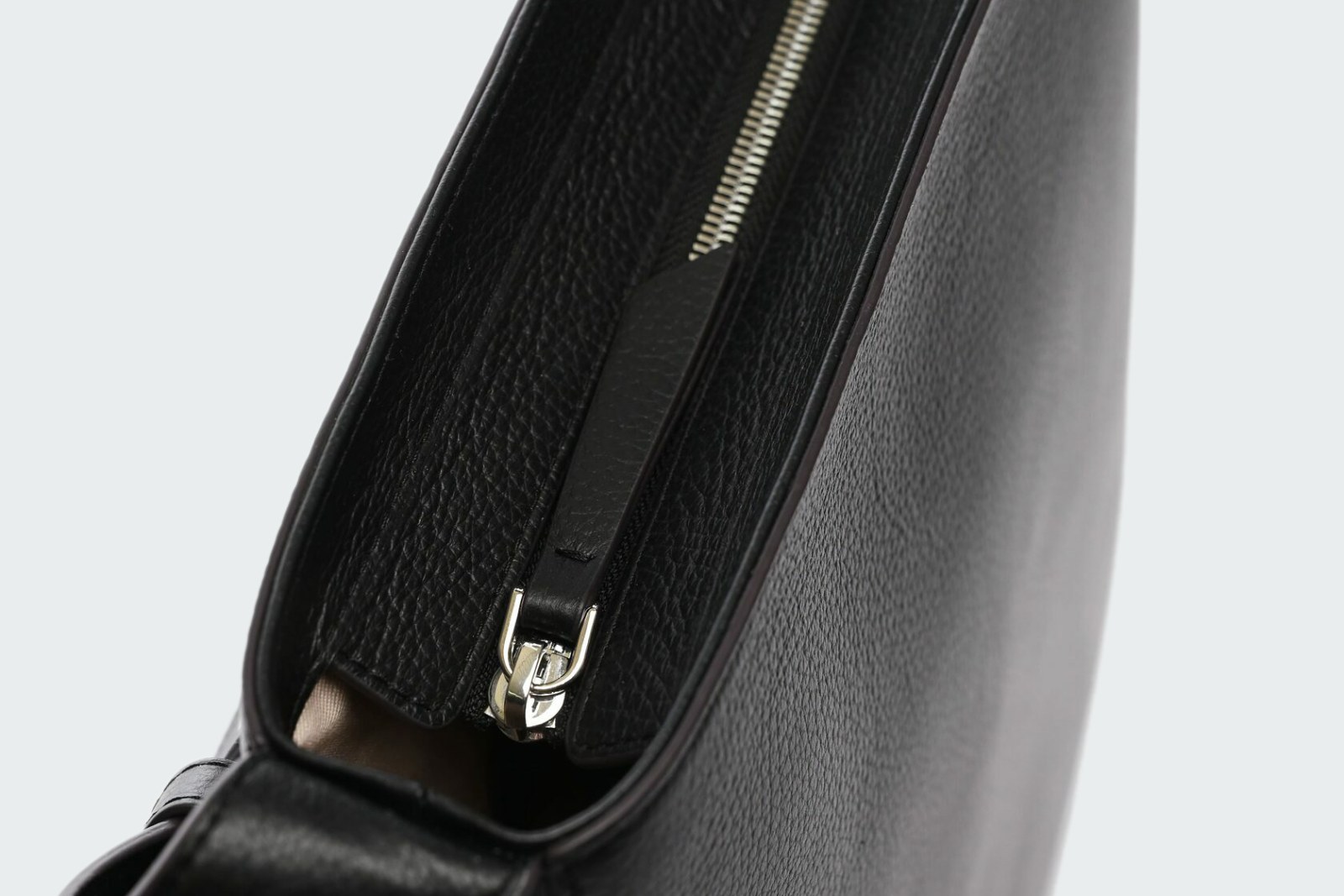 Модель выполнена из мягкой зернистой кожи и закрывается на молнию. Внутрь поместятся планшет, смартфон, кошелек и складной зонт.