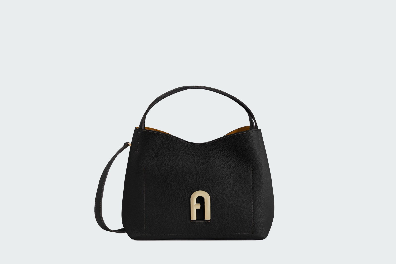 Furla Primula – маленькая сумка-хобо из зерненой телячьей кожи с контрастной внутренней подкладкой. Модель мягкой формы украшена металлическими деталями и фирменным логотипом Arch с гальванической золотистой отделкой и тисненым логотипом Furla сзади. Идеальный аксессуар, который позволяет всегда иметь под рукой все самое необходимое.