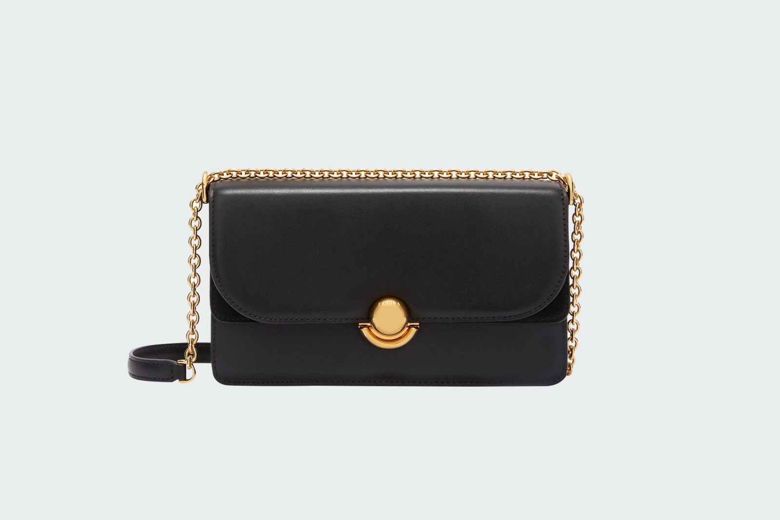 Сумку Furla Sfera с замшевой отделкой и скользящим ремнем-цепочкой выполнили из телячьей кожи. Модель с двумя внутренними карманами застегивается замком-защелкой Sfera.