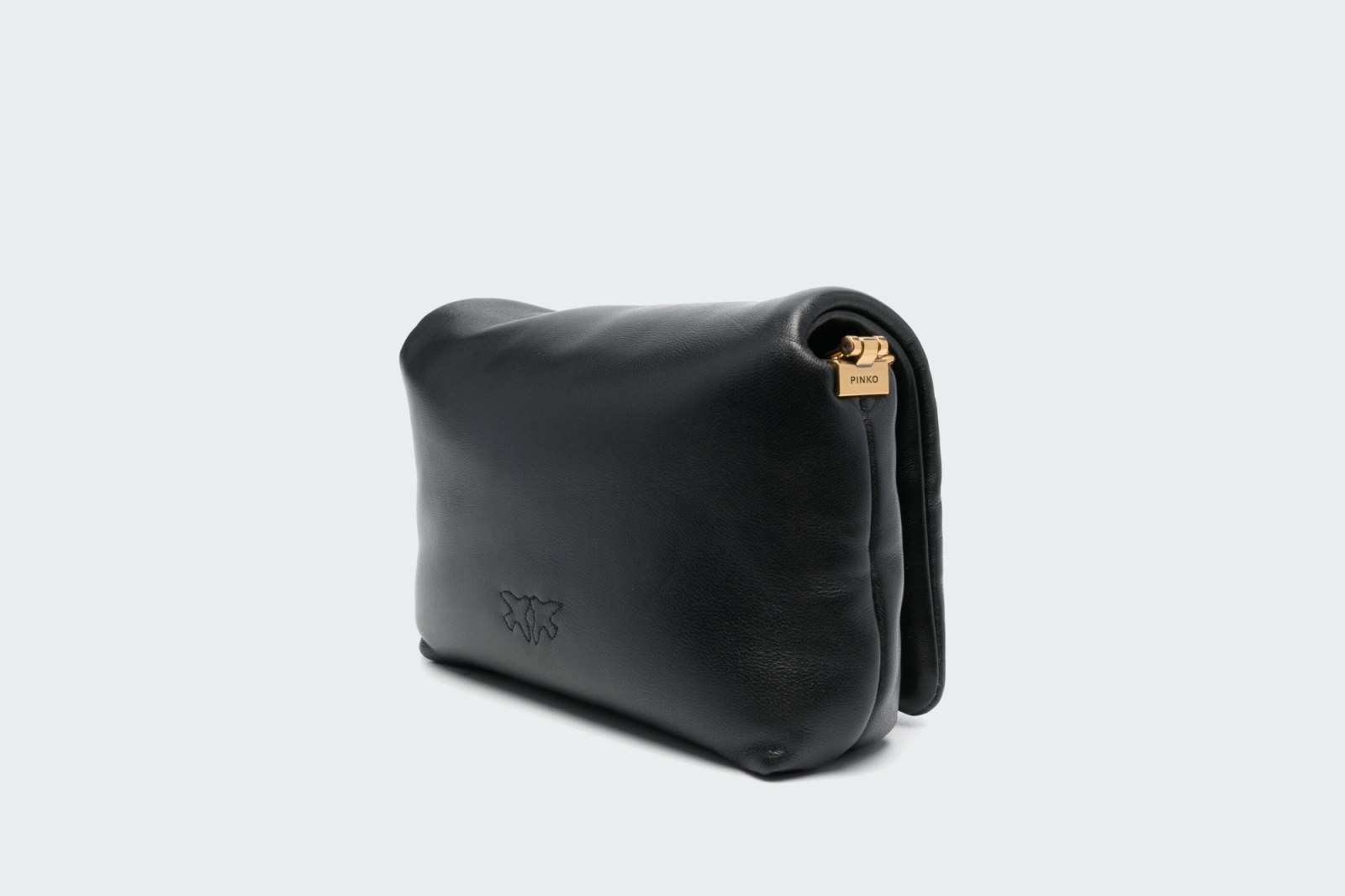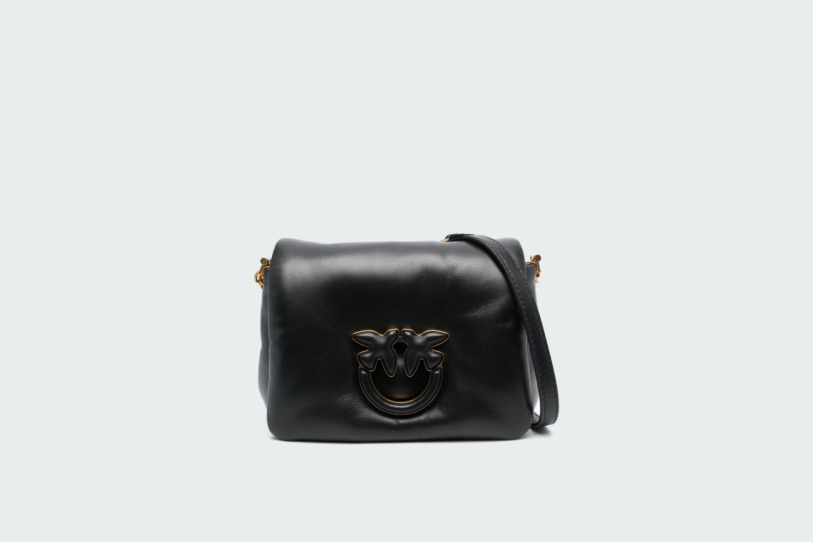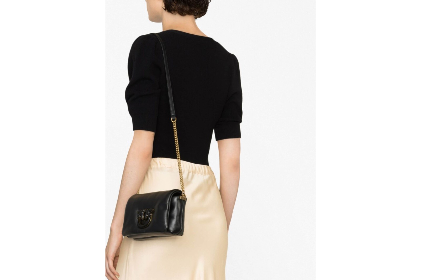 Черная сумка из телячьей кожи с регулируемым кожаным и цепочным плечевым ремнем, вышитым логотипом на задней части, фирменной пряжкой Love Birds на клапане, скрытой магнитной застежкой, основным отделением, внутренней нашивкой с логотипом и внутренним карманом на молнии, фурнитура золотистого цвета