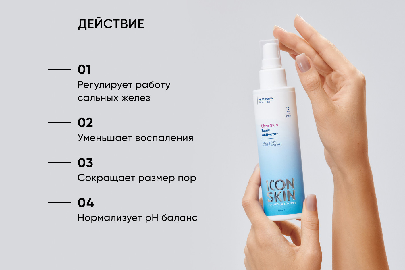 Удобный дозатор позволяет рационально расходовать средство. Тоник усиливает действие последующего ухода и является ключом к эффективной работе всей системы ICON SKIN RE:PROGRAM.