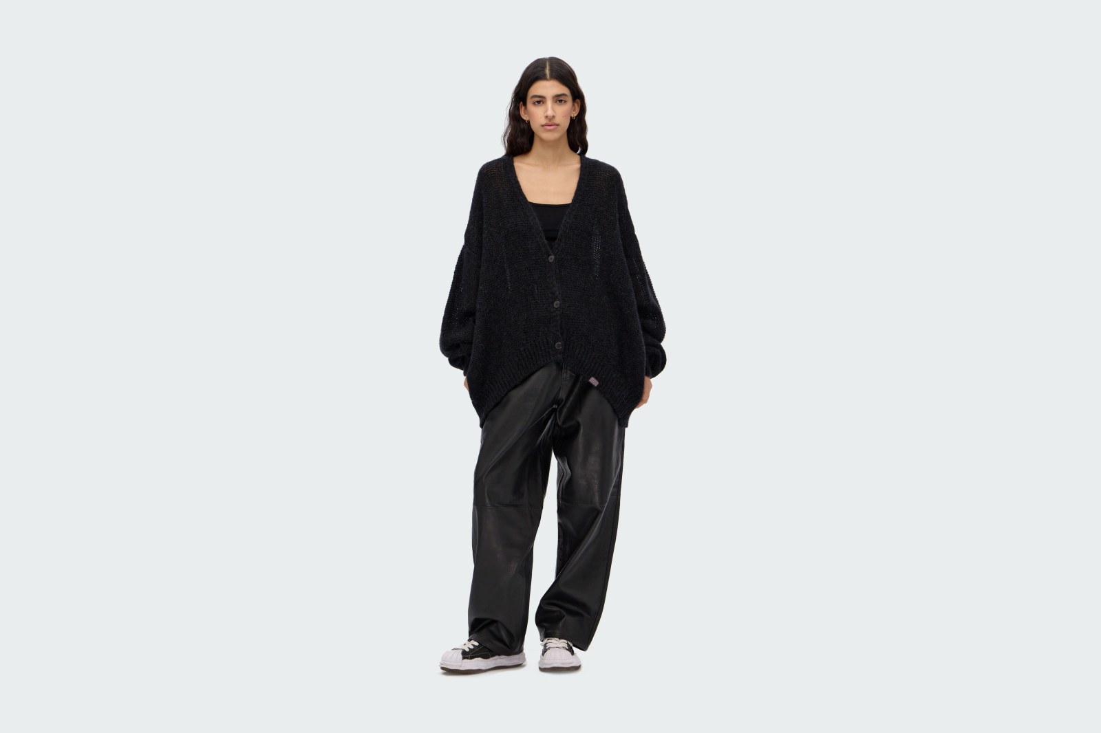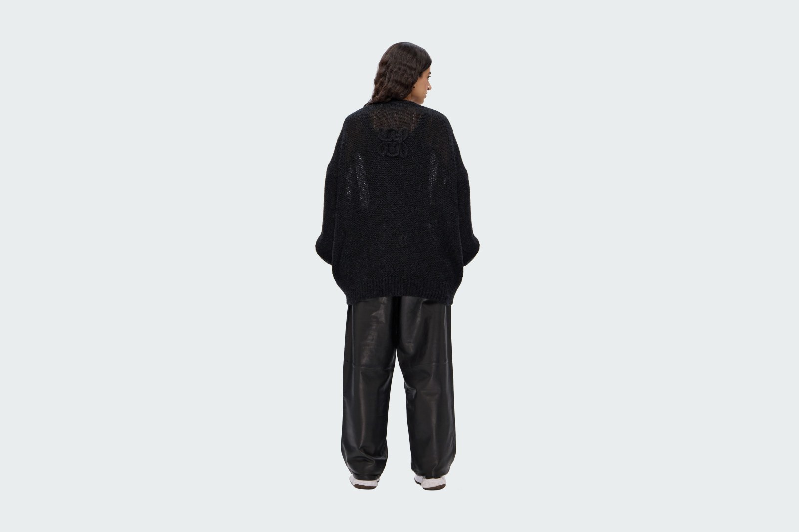 Мягкий кардиган oversize-кроя с эффектной крупной вязкой и V-образным вырезом. Модель с объемными рукавами и приспущенными плечами украшена брендированными пуговицами и вывязанным паттерном MONOCHROME на спинке.