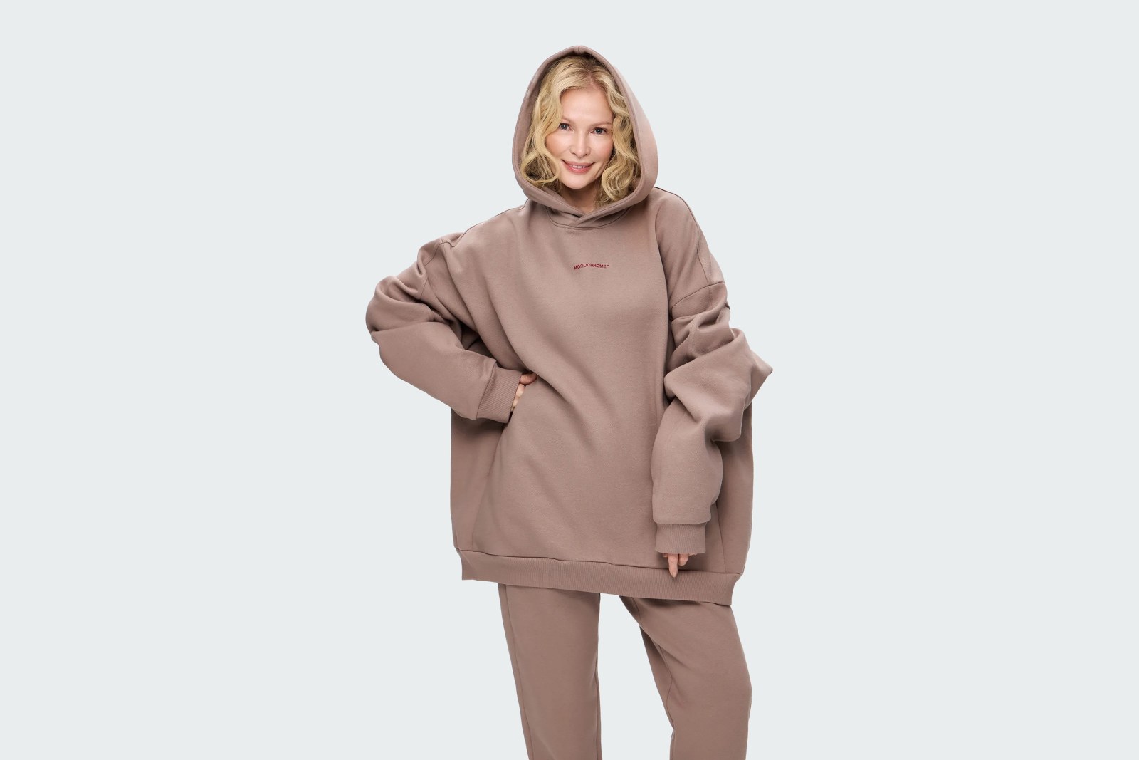 Худи бежевого цвета с капюшоном. Петельная текстура полотна из 100% хлопкового футера с мягкой изнанкой. Рельефный логотип MONOCHROME на груди. Скрытые боковые карманы. Глубокий капюшон с продольным сечением. Эластичные манжеты на рукавах. Onesize&unisex.