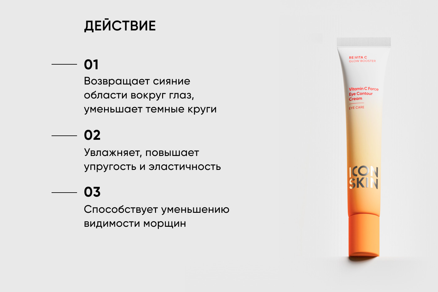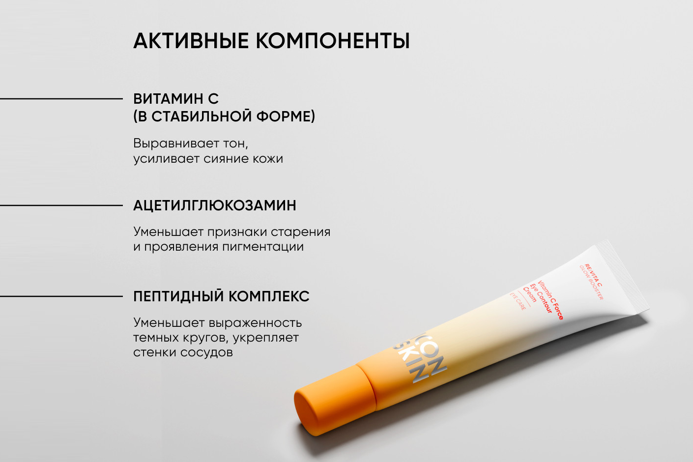 Крем для кожи вокруг глаз эффективно борется с признаками усталости и уменьшает темные круги под глазами. Витамин С в стабильной форме и ниацинамид (B3) выравнивают тон и улучшают текстуру кожи. Пептид и гиалуроновая кислота обеспечивают глубокое увлажнение и уменьшают признаки возрастных изменений: способствуют сокращению видимости морщин, повышают упругость, эластичность и тургор кожи вокруг глаз. Крем имеет нежную текстуру и быстро впитывается.