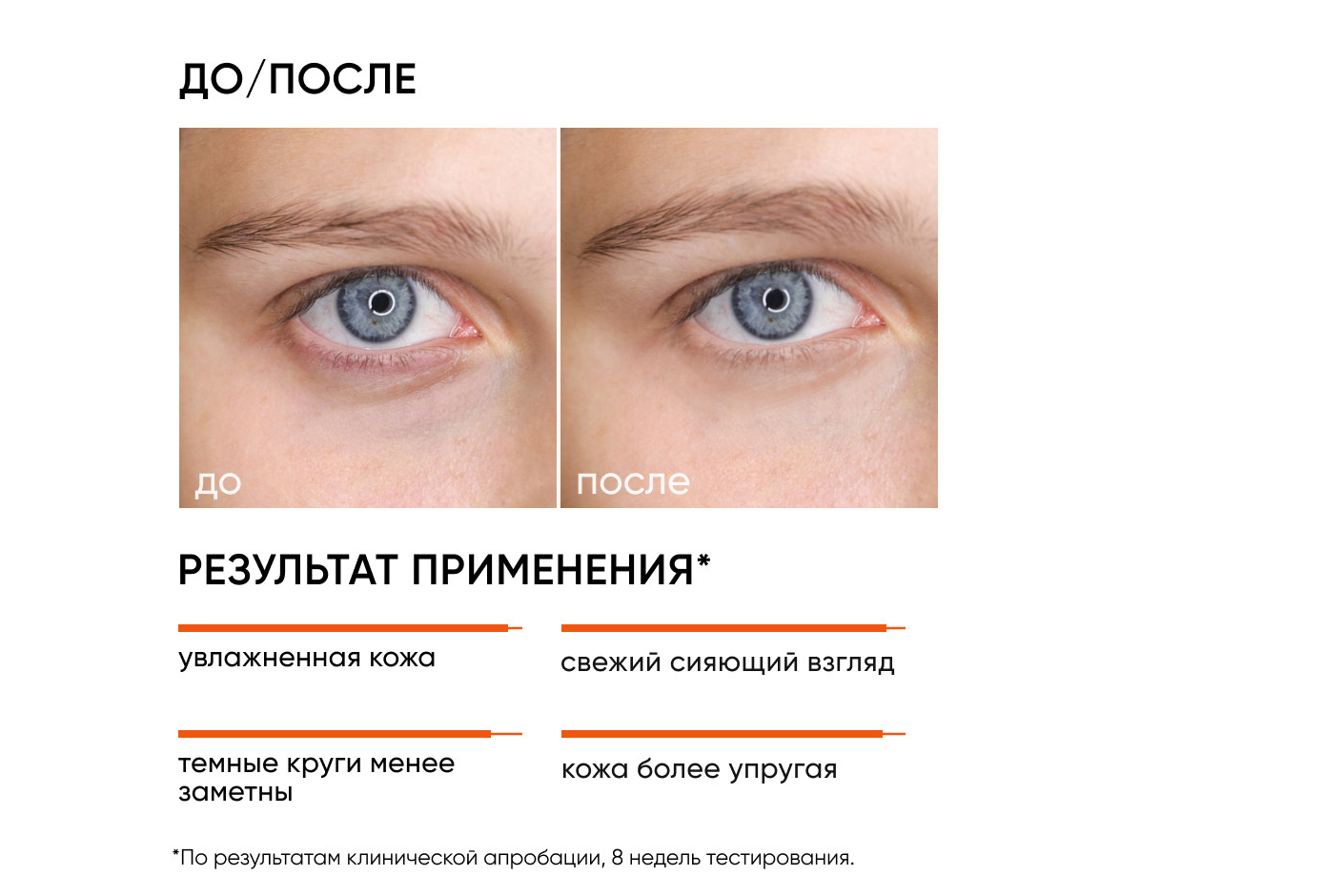 РЕЗУЛЬТАТ: свежий взгляд, упругая и увлажненная кожа вокруг глаз без темных кругов.