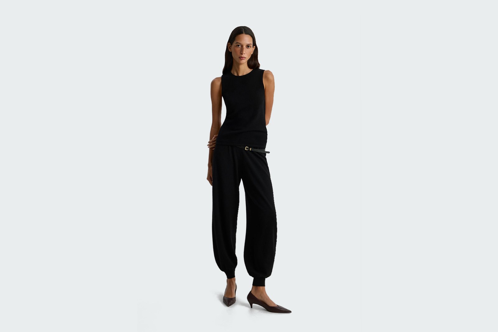 Новый фит — брюки-аладдины со сборкой и резинкой по низу. Модель на средней посадке с эластичной резинкой под поясом.