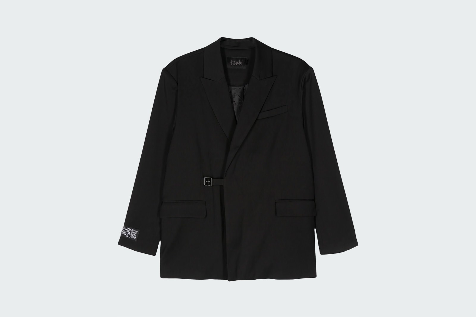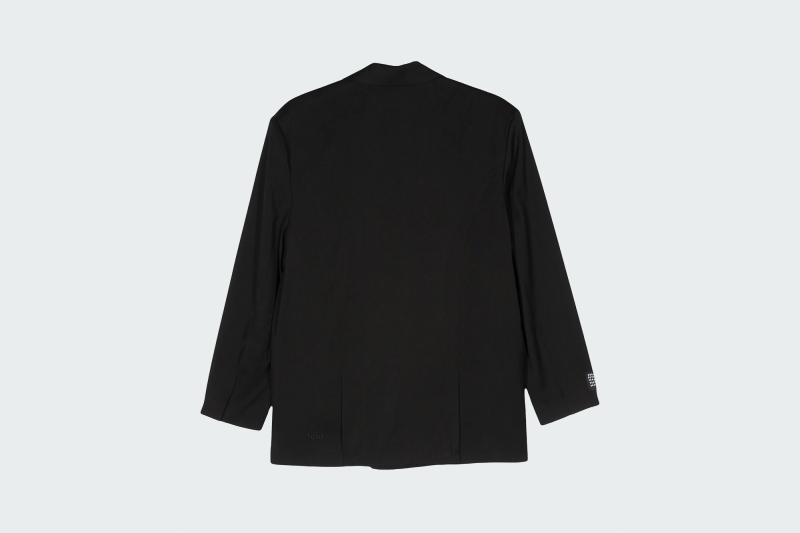 Черный пиджак с подплечниками, длинными рукавами и заостренными лацканами. Дополнены нашивкой-логотипом на манжете, прорезным карманом на груди и двумя передними карманами с клапанами. Жаккардовая подкладка с логотипом, потайная пуговичная застежка спереди и застежка на пряжке.
